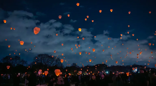 感謝の気持ちや願いを灯した熱気球型ランタンが深北緑地の春の夜空へ舞い上がる、ロマンチックで幻想的なひとときが大切な人との特別な思い出を紡ぎます。