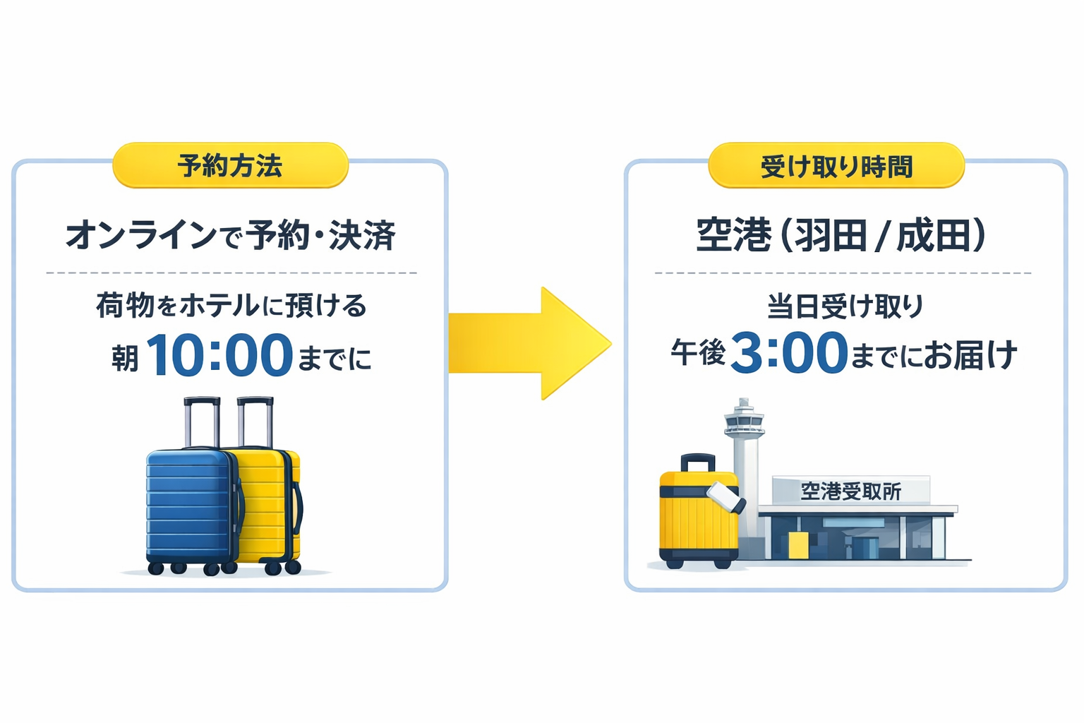 また、本サービスはお客様ご自身で簡単に利用できるセルフ予約型の仕組みを採用しています。専用サイトまたはアプリから予約後、専用の手荷物タグに必要事項を記入して荷物に取り付け、ホテルフロントへお預けいただくだけで手続きが完了します。
