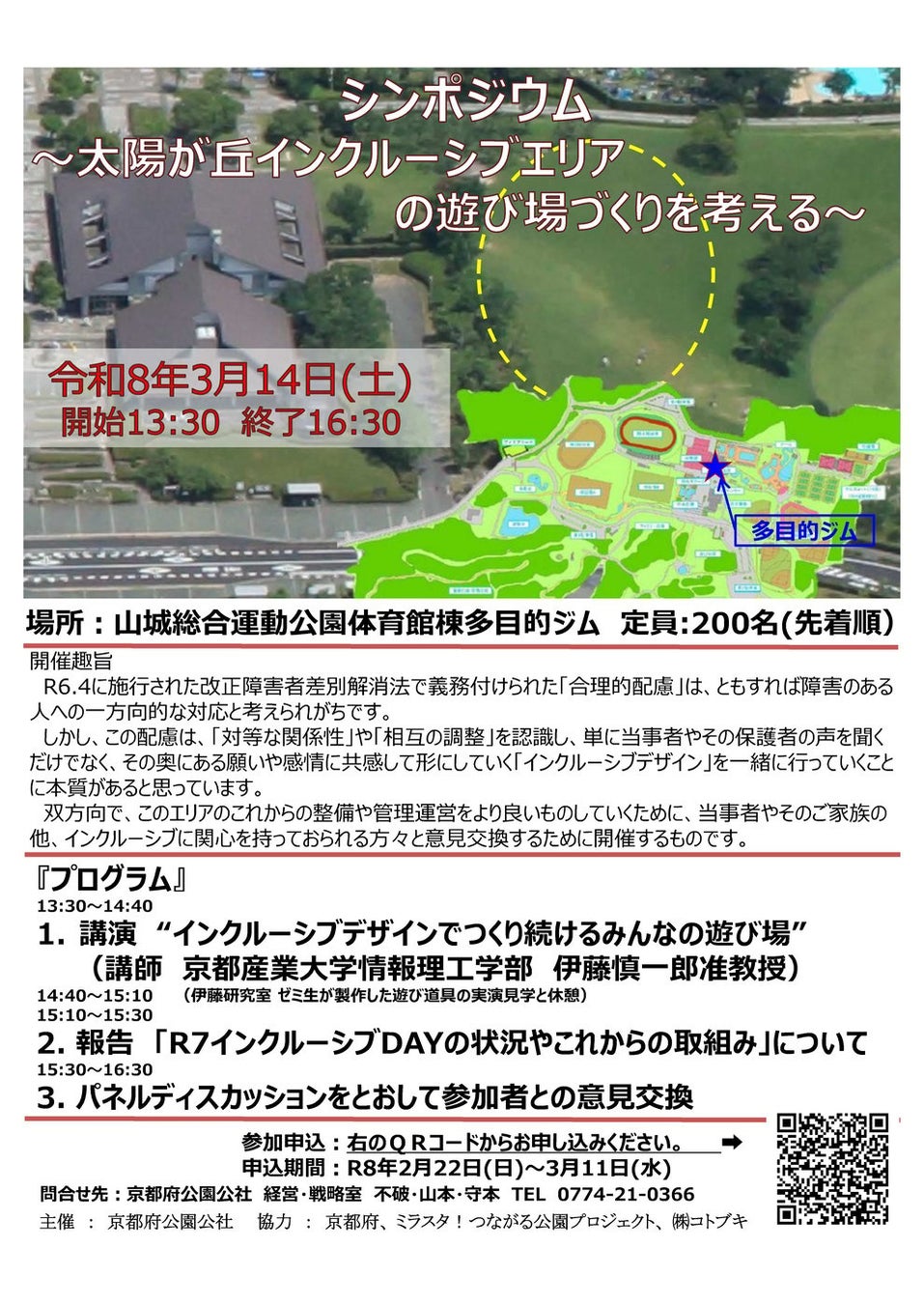 京都産業大学情報理工学部伊藤慎一郎研究室の学生らは、京都府および公益財団法人京都府公園公社が主催する「太陽が丘インクルーシブエリアの遊び場づくりを考えるシンポジウム」に参画します。