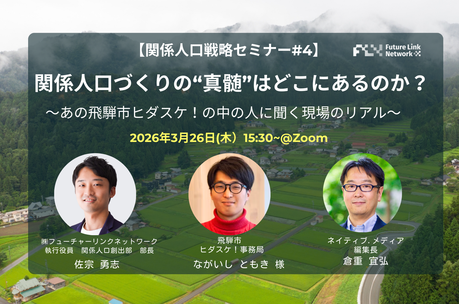 関係人口創出を推進する株式会社フューチャーリンクネットワーク(本社:千葉県船橋市、代表取締役:石井丈晴、以下FLN)は、2026年3月26日(木)に、自治体の関係人口・移住促進施策に携わる方を対象としたオンラインセミナー「【関係人口戦略セミナー#4】関係人口づくりの’真髄’はどこにあるのか? ~あの飛騨市「ヒダスケ!」の中の人に聞く現場のリアル~」を開催いたします。ゲストに、関係人口創出の先進モデルとして全国から注目を集める岐阜県飛騨市の「ヒダスケ!」を現場で動かしてきた事務局のながいしともき氏を迎え、FLN関係人口創出部 部長の佐宗勇志とともに、現場の実践知を掘り下げます。