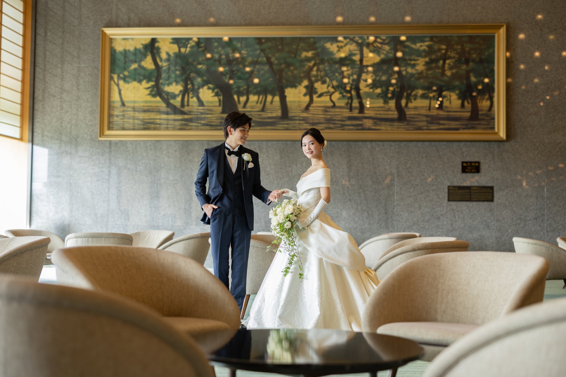また、当ホテルでは、四季折々の美しい景色が広がる約600坪の日本庭園や、日本の伝統美を取り入れたメインロビーなど、オークラならではの空間でお二人の節目を記録に残します。