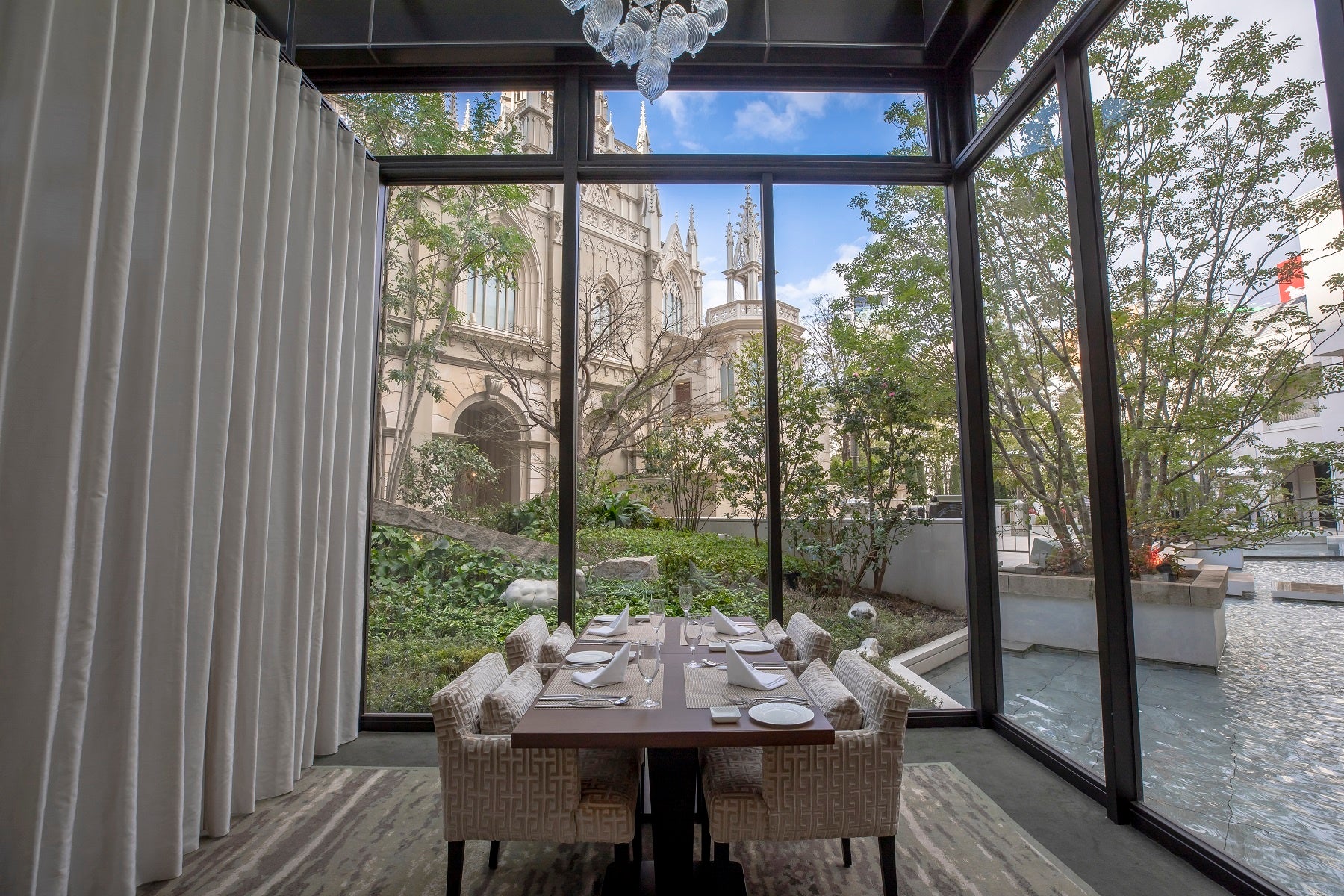 和装撮影の後は私服にお着替えいただき、お城のような大聖堂を望むストリングスホテル 名古屋のフレンチレストラン「グラマシースイート」へ。撮影の余韻をそのままに、リラックスして美食をお楽しみいただけます。