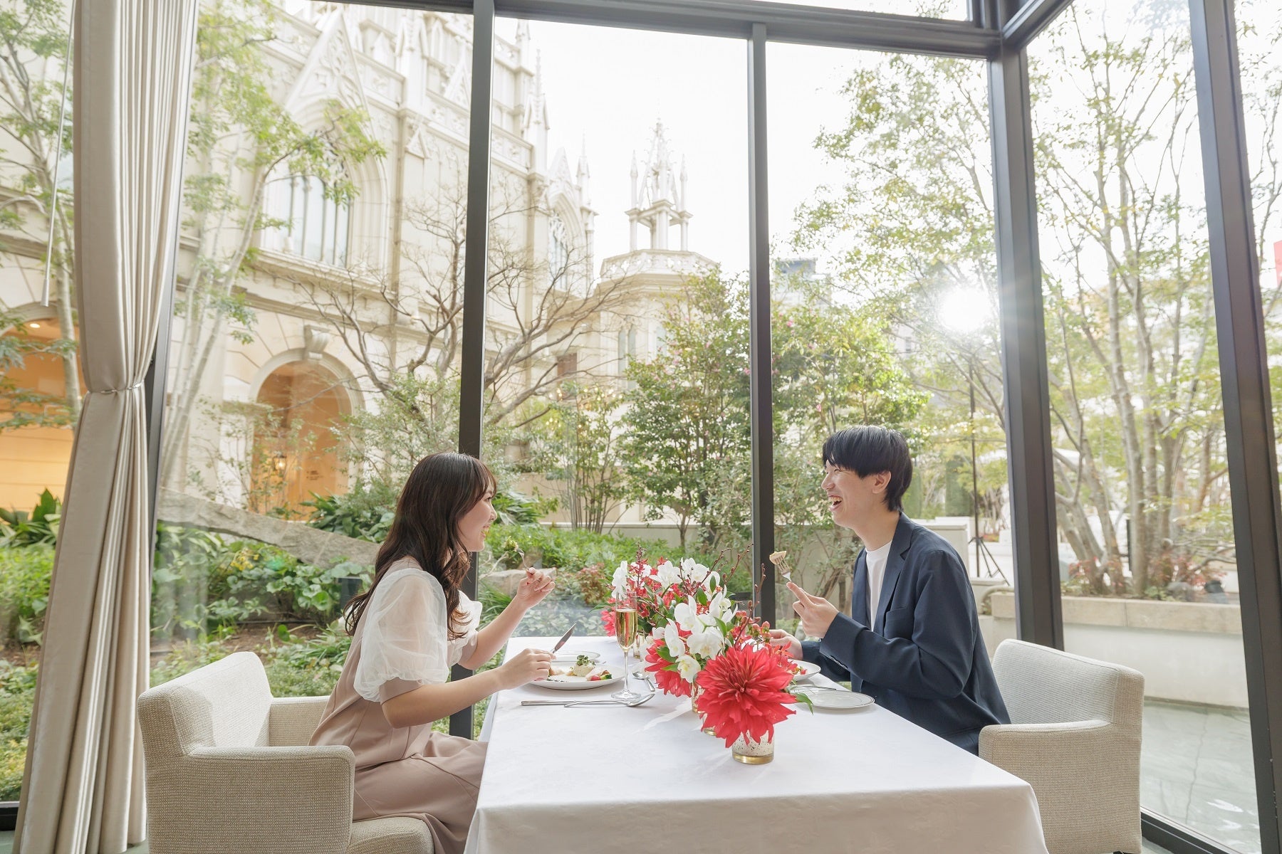和装撮影の後は私服にお着替えいただき、お城のような大聖堂を望むストリングスホテル 名古屋のフレンチレストラン「グラマシースイート」へ。撮影の余韻をそのままに、リラックスして美食をお楽しみいただけます。