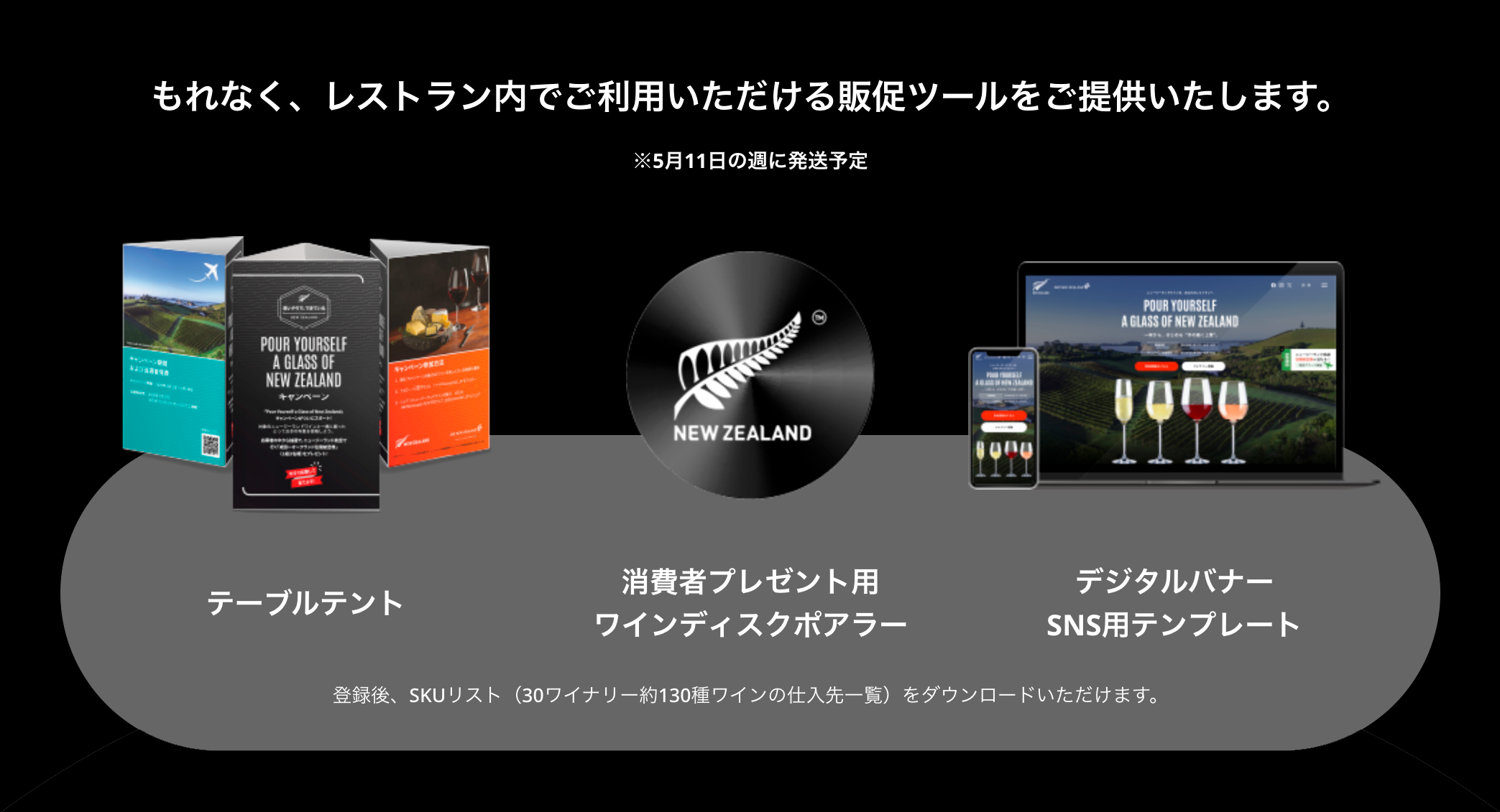 昨年は16ワイナリーが参加した本キャンペーンですが、今年はなんと約2倍の30ワイナリーに拡大ワイン銘柄も約130種からお店に合ったワインを選ぶことができるようになりました。6月1日から始まるキャンペーンでは、ニュージーランド大使館商務部によるお客様向けプロモーションも予定されているので、参加いただくことで、店舗の注目度や信頼度の向上が期待できます。もちろん、ニュージーランドワインを楽しんでいただける仕掛けも盛りだくさん。店舗の負担を最小限にしつつ、効果的なプロモーションをサポートしますので、ぜひ一緒に盛り上げましょう。