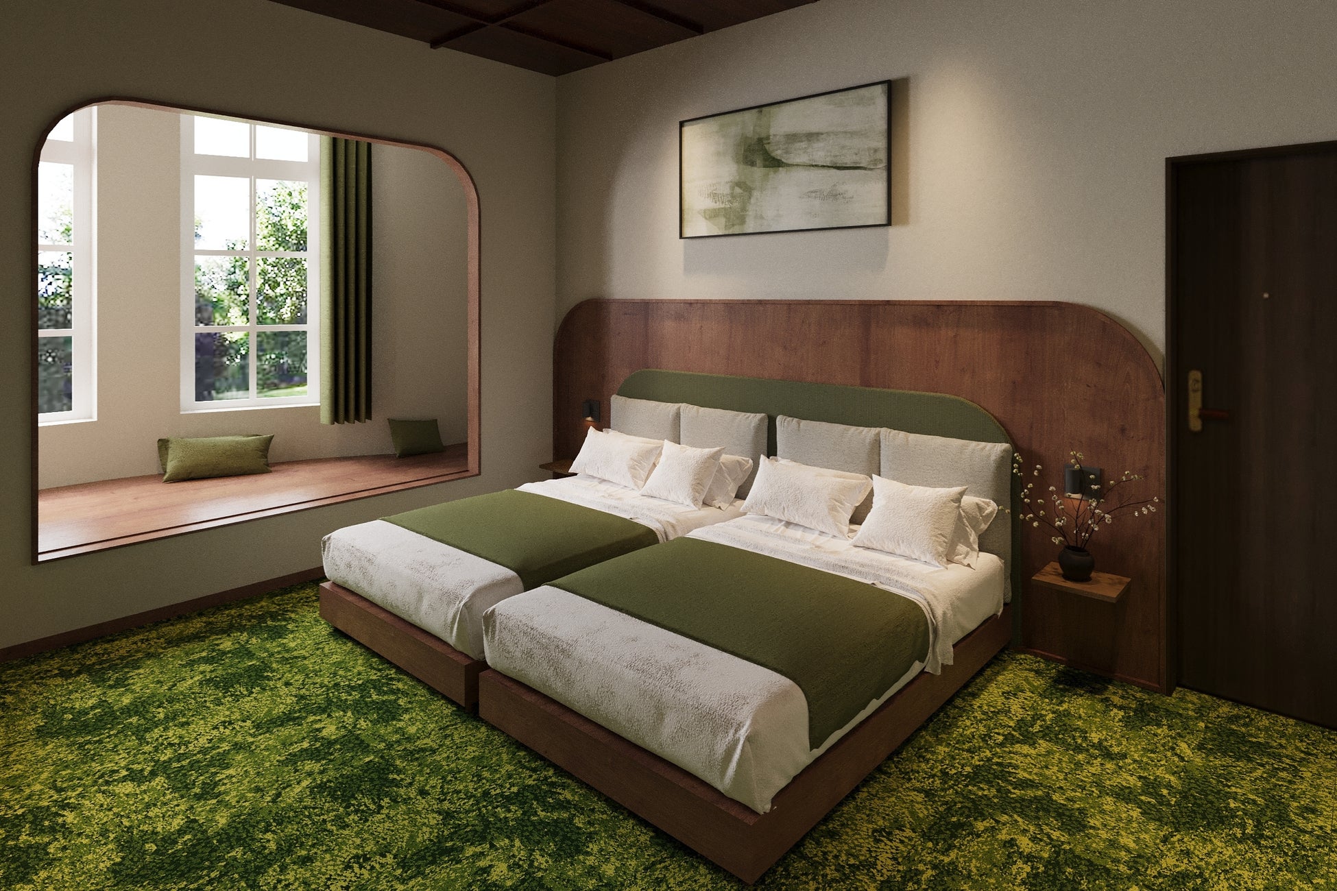 T9の窓から望む函館山の緑を写し取った、自然の心地よさを感じられる空間。