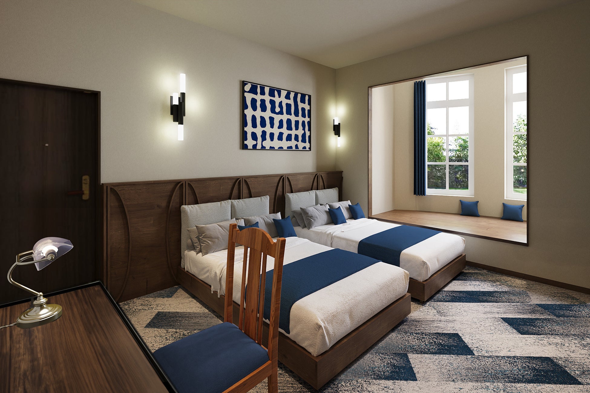 2階は、全5室の部屋ごとにコンセプトが異なるホテル。2024年グッドデザイン賞受賞チームにより、函館を象徴する風景を「色」として抽象化し、まちの色を静かに味わえる内装デザインとなっています。