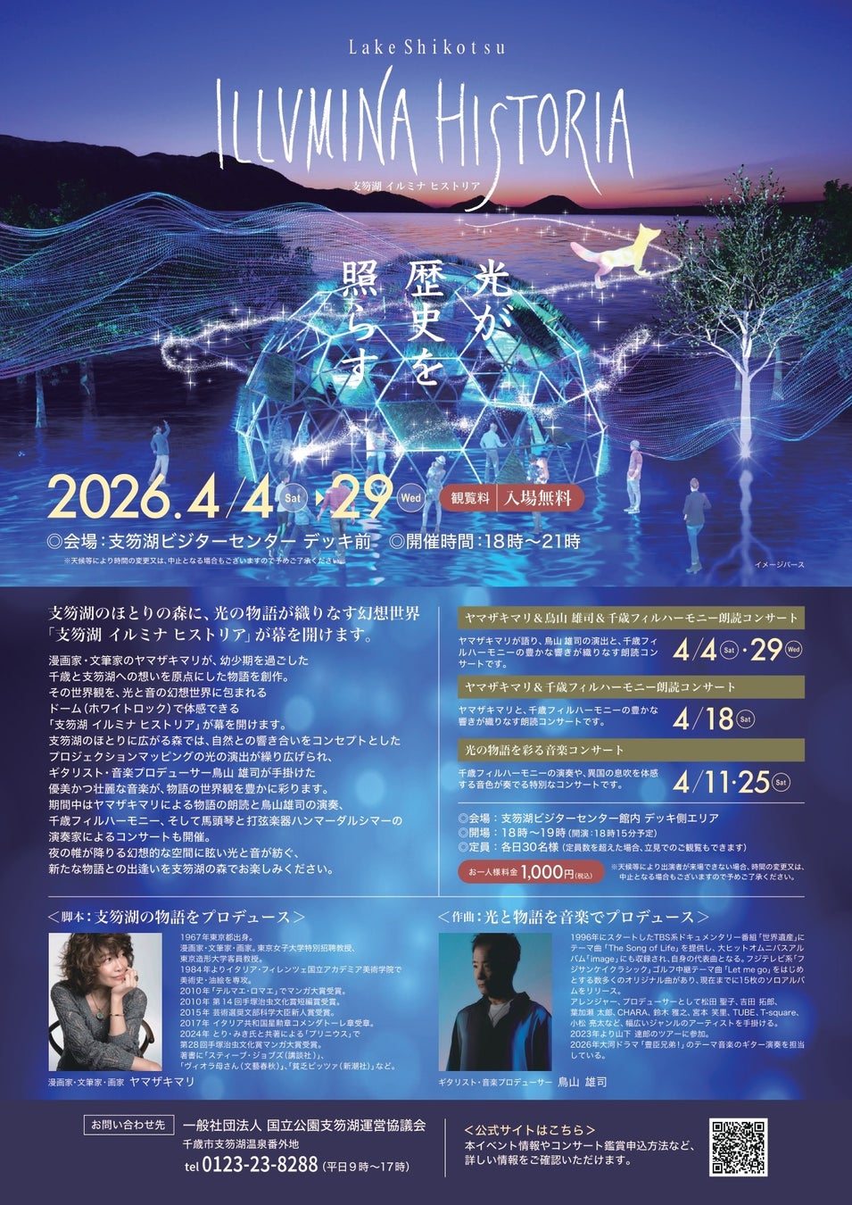 「しこつ湖 鶴雅リゾートスパ 水の謌」「しこつ湖 鶴雅別荘 碧の座」のある北海道・支笏湖にて今春、光と音のイベント「支笏湖 ILLUMINA HISTORIA(イルミナヒストリア)」が初めて開催されます。湖畔の森を舞台に、プロジェクションマッピングによる幻想的な世界が広がる体感イベントです。この世界の物語を監修するのは、『テルマエ・ロマエ』の作者である漫画家・文筆家のヤマザキマリ氏。そして物語を彩る音楽は、ギタリスト・音楽プロデューサーとして活躍する鳥山雄司氏が手掛けます。期間は4月4日(土)から29日(水・祝)まで。1か月間限定で織りなす新たな物語を、どうぞお楽しみください。