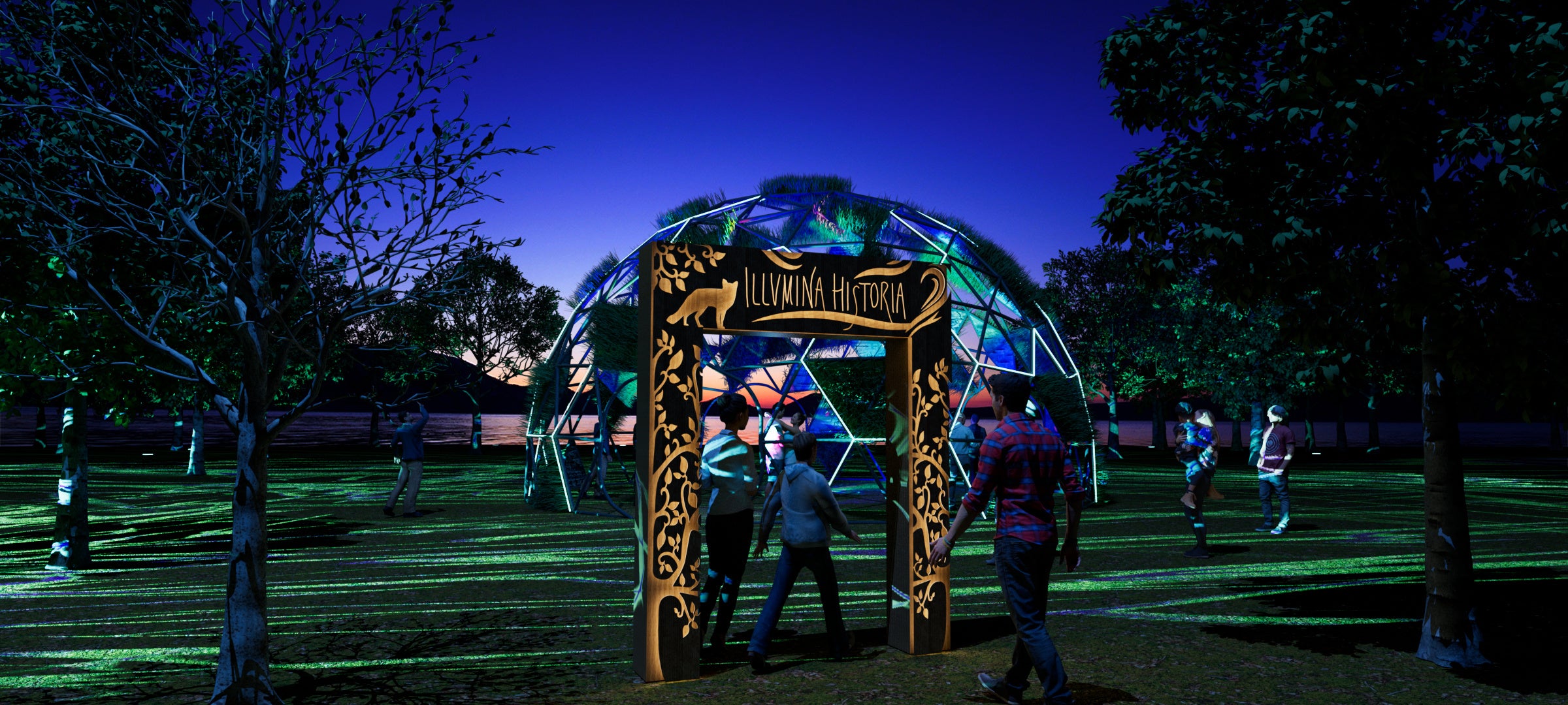 会場となる支笏湖ビジターセンターのデッキ前広場で、自然と調和したプロジェクションマッピングが繰り広げられます。木々やドーム(ホワイトロック)を幻想的に照らし、訪れる人々を物語の世界へ誘う没入空間を展開。支笏湖の歴史と息吹を映します。
