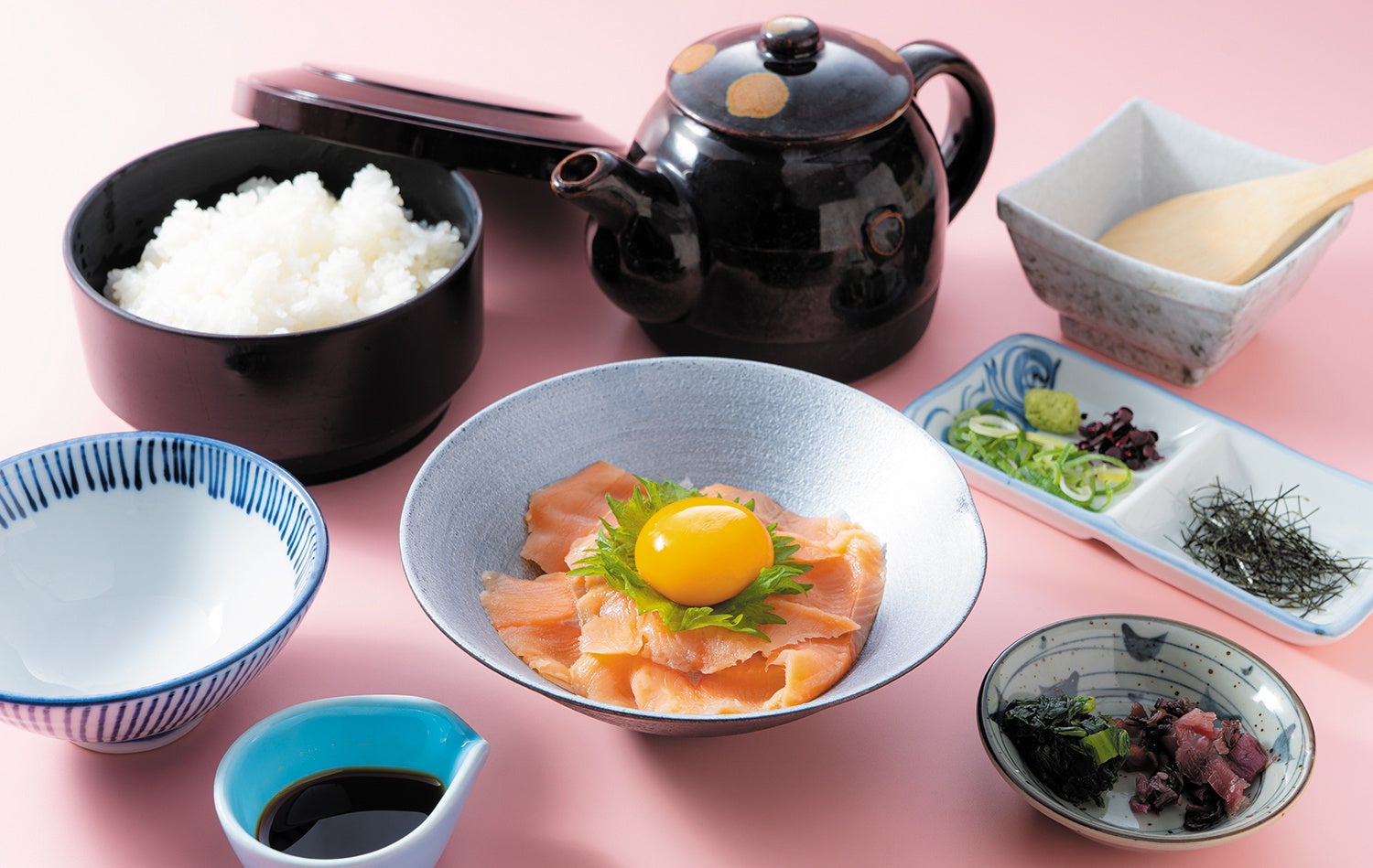 上品な脂がのったサクラマスを、自家製の漬け醬油と卵黄で絡めた贅沢な一杯。最初はそのまま、後は薬味と合わせて出汁茶漬けとしてどうぞ。