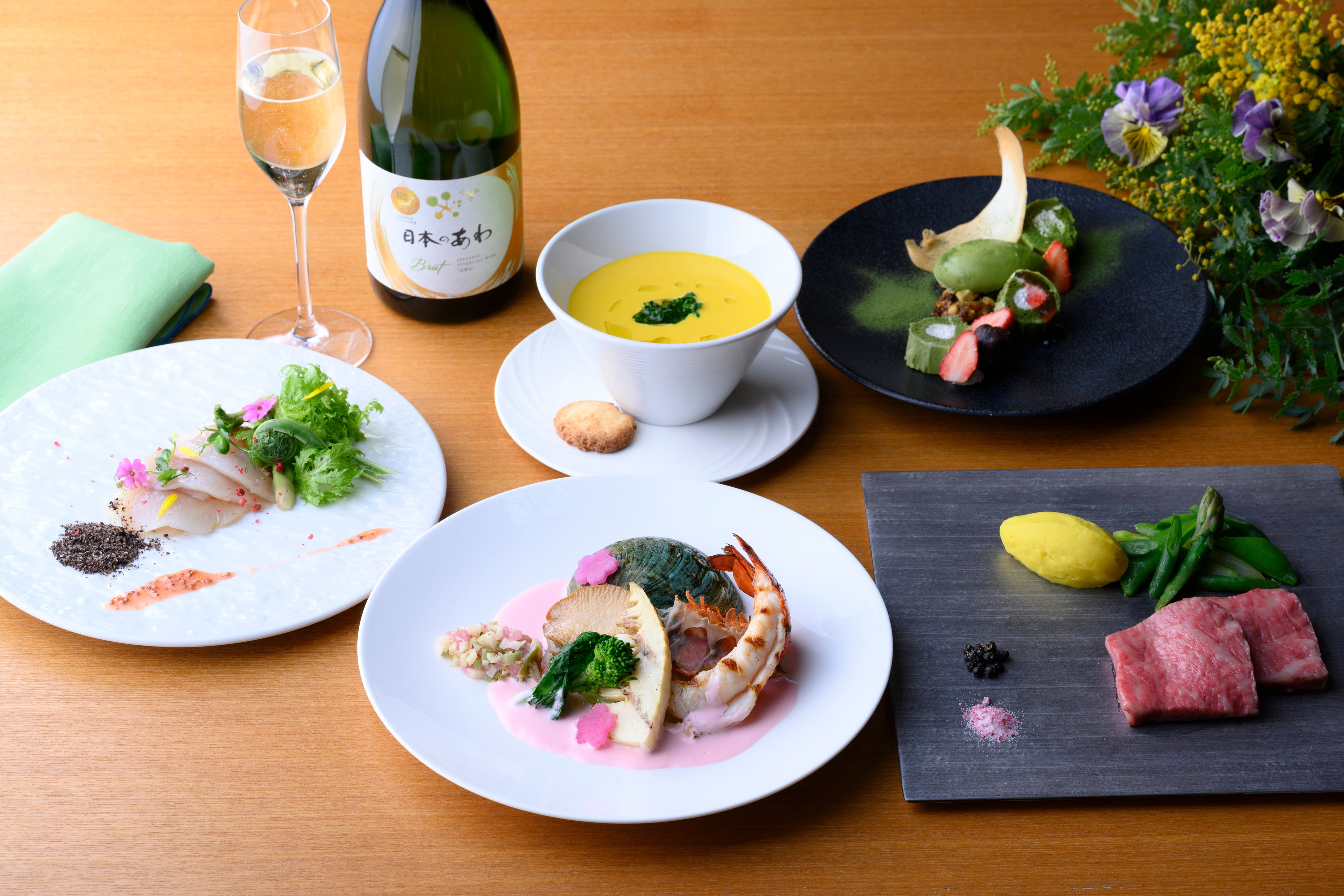 雪解けとともに一気に色づく白馬村の春。春の白馬に芽吹く命のきらめきを一皿一皿に込め、五感で楽しむ特別なひとときをご提供いたします。今春のシェフの一押しは、オマール海老をはじめとした贅沢な食材と、信州アルプス牛など地産食材をかけ合わせたコース「PRESTIGE(プレステージ)」。軽く燻製をかけたシナノユキマスの前菜は、山桜はちみつのやわらかな甘みと山菜のほろ苦さが重なり、信州の春景色を思わせる香りを広げます。雪の下で甘みを蓄えた人参と地元酒蔵の酒粕を合わせたポタージュは、滋味深い余韻とともに土地の恵みを伝えます。オマール海老とアワビを贅沢に合わせ、日本のあわと桜の香りをまとわせた華やかな一皿を用意しました。ハーブオイルでしっとり仕上げた信州アルプス牛には新緑野菜を添え、大地の息吹を感じる味わいに。季節の素材を重ねた一皿ごとに、白馬の春の風景がゆっくりと立ち上がる構成となっています。春の白馬の風景とともに、信州の恵みが織りなす味覚と香りが記憶に残る特別な時間を、大切な人とのひとときにお楽しみください。