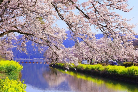 琵琶湖の北にたたずむ静かな湖。湖畔や導水路沿いでは、桜と菜の花が同時に目に飛び込む、春らしい彩りの景色が広がります。特に風がやむ朝は湖面が穏やかになり、桜の“映り込み”が主役に。にぎやかな名所とはひと味違う、静けさを味わうお花見ができます。