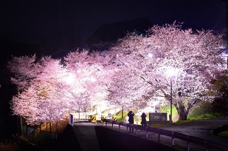見頃にはライトアップが行われ、夜桜も楽しめます。桜の植樹やライトアップは美松ゴルフセンター様のご厚意によるもの。地域の支えがあってこそ守られている春景色です。