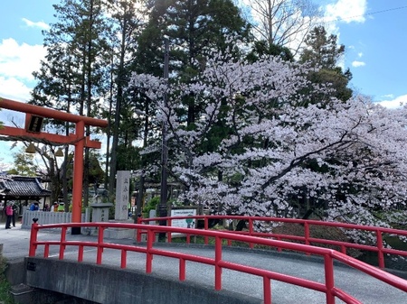 川沿いに咲く桜と朱色の鳥居の対比は、思わず写真に収めたくなる風景。春らしい明るさと神社の厳かな雰囲気が溶け合います。※前面道路は交通量が多いため、観賞時はご注意ください