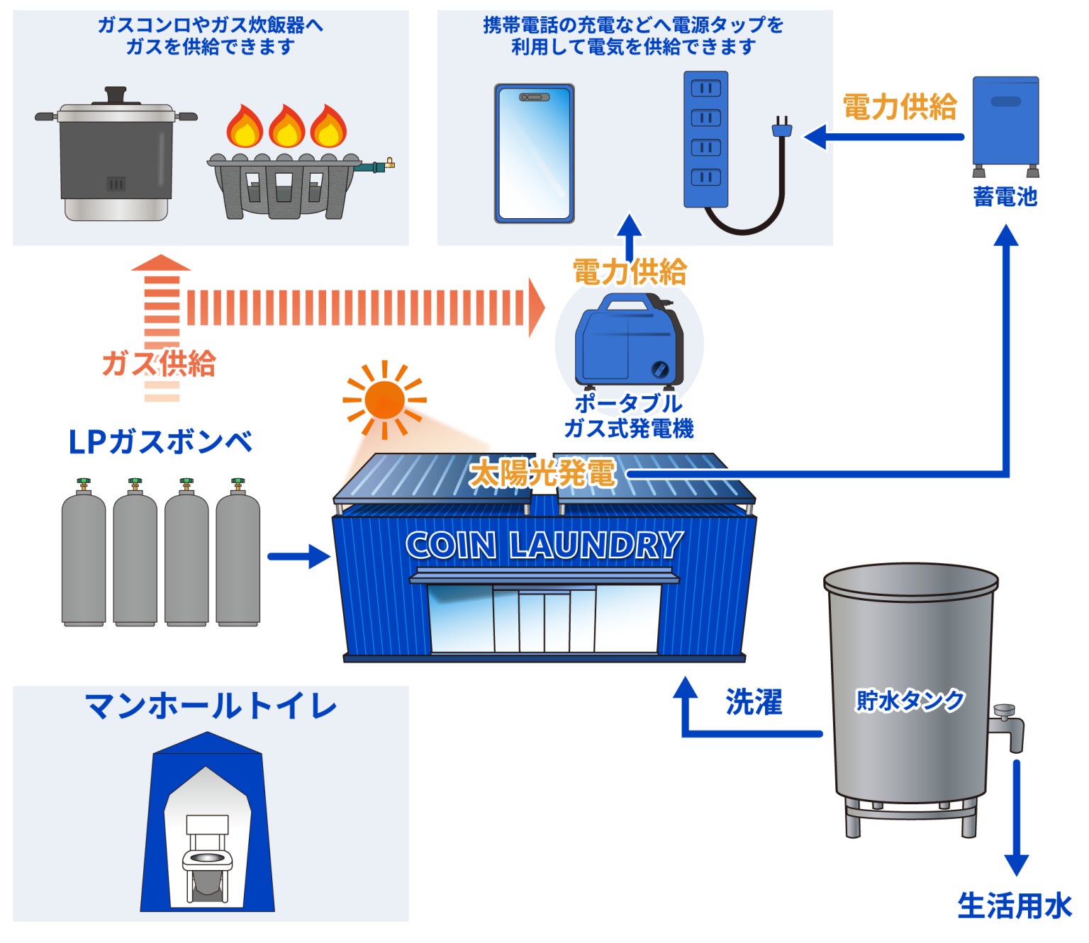 災害発生時には水・電気・ガスを自給する「オフグリッド型」パッケージとし、平常時も稼働させる「フェーズフリー運用」にて、災害発生時の洗濯に備えます。また「災害備蓄ランドリー® 」を、あらかじめ避難所や公共施設のそばに設置することで、災害発生後すぐの使用が可能となります。