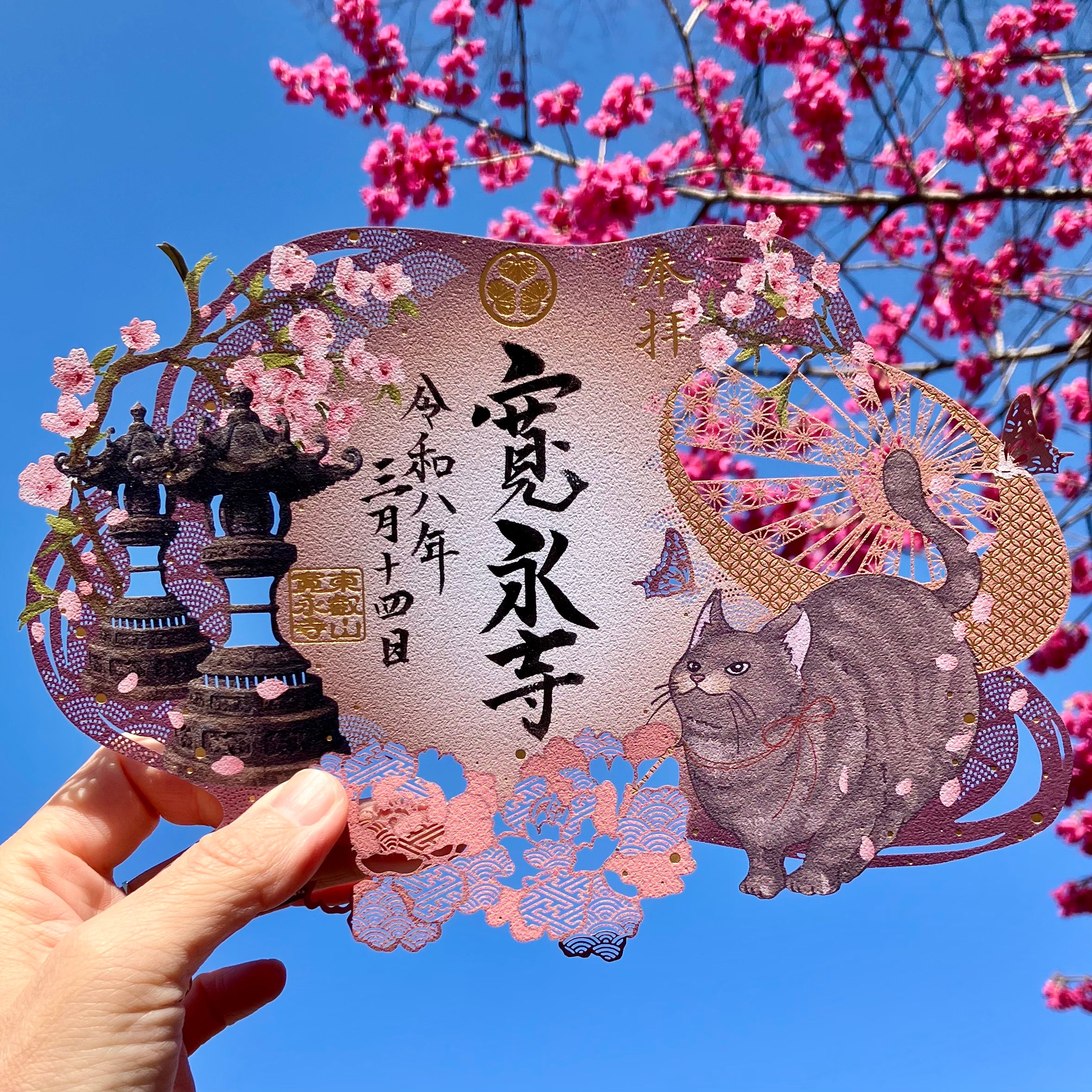 春のやわらかな光に包まれた寛永寺の境内に、静かに佇む地域猫の姿を描いた切り絵御朱印です。
