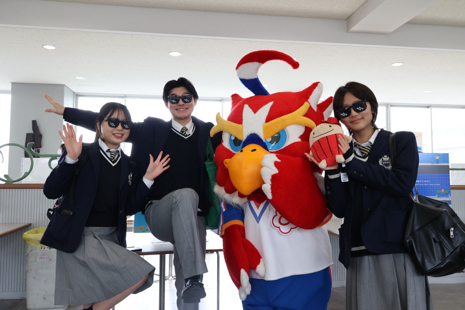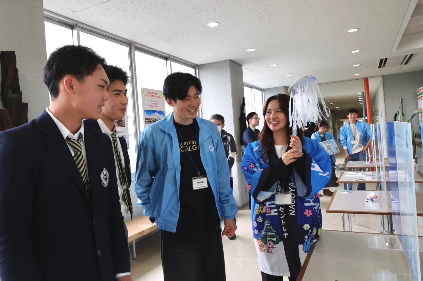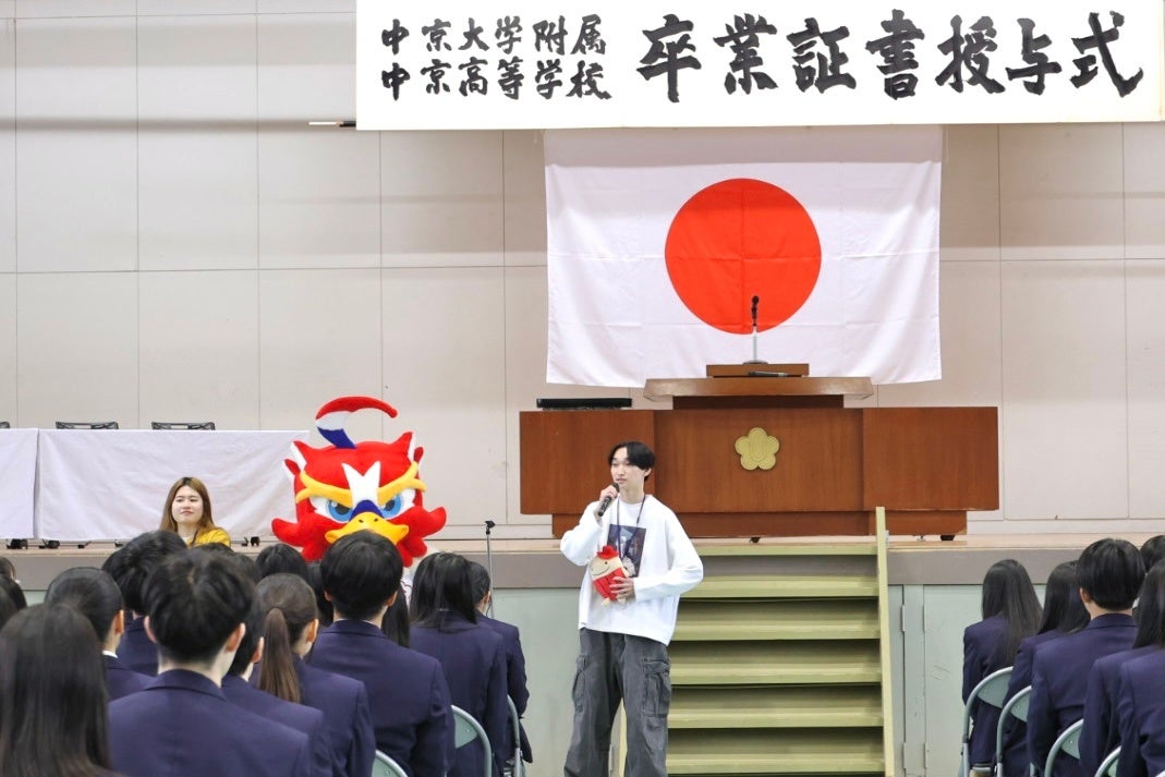 さらに、高校側のご協力で卒業前の生徒へ直接PRする機会を得て、中京大学のマスコットキャラクター「チューグル」と中京大学出身のOB学生が登場し、イベントの魅力を熱く紹介。多くの高校生が興味を持ち、実際に来場へつながりました。