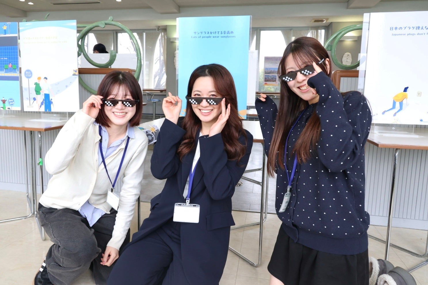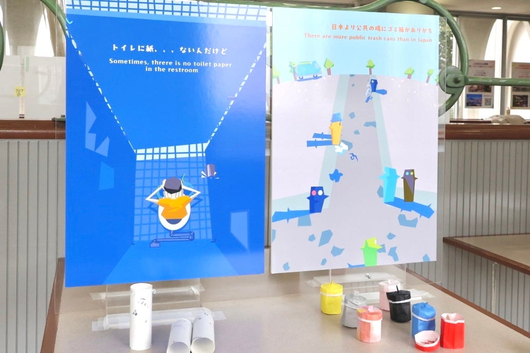 さらに、パネルと一緒に写真撮影を楽しめるように、自作のゴミ箱やトイレットペーパーの芯、サングラスなど、大学生の視点を活かし、ユニークで海外らしさを感じる小物をたくさん用意し、海外体験の雰囲気を気軽に味わえるようにしました。高校生たちは、見て・触れて・撮って楽しめる仕掛けを取り入れたことで、「映える」体験をしながら、自然と海外への興味を高めていました!!