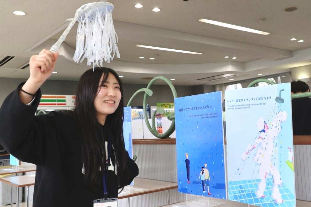 高校生に写真を撮ってもらい、SNSなどで拡散していただけるように、アルミホイルや段ボールなどの身近な素材を使い、シャワーヘッドなどの小物を手作りし、「写真映え」する展示へアップデート!学生の創意工夫で、展示の体験性と楽しさを高めただけではなく、よりリアルで共感性の高い展示内容を実現しました。また、会場でしか体験できない仕掛けを導入したことで、参加意欲と満足度の向上を図りました。