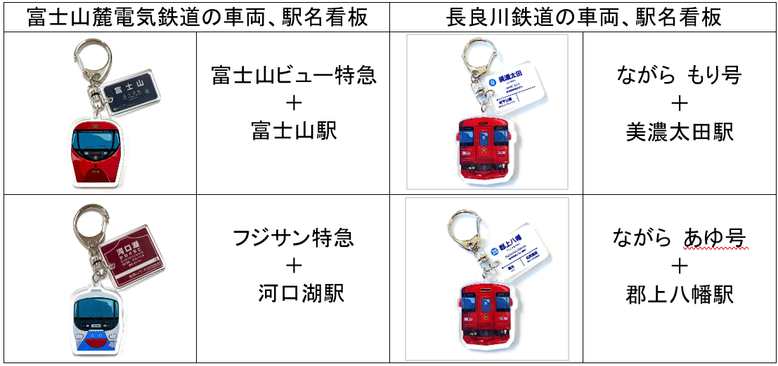 観光列車の車両アクリルキーホルダーに、始発駅または観光地最寄り駅の駅名看板を組み合わせたデザイン(長良川鉄道・富士山麓電気鉄道 各2種類販売)
