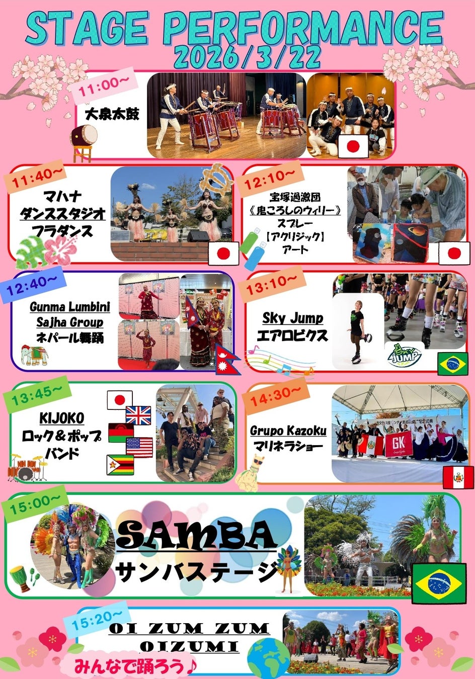 3月22日(日)午前11:00~午後4:00 @群馬県大泉町いずみ緑道・花の広場で開催!! ステージでは日本太鼓から始まり、ブラジルサンバで締めくくります!!