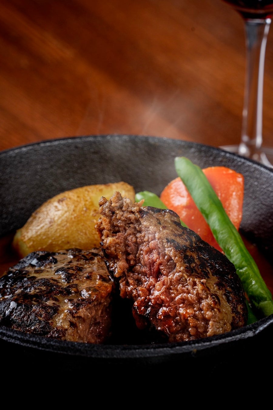 使用する牛肉は、近江牛専門牧場「岡崎牧場」より仕入れる長期飼育牛を採用。じっくり育てられた牛ならではの旨味と脂の甘みを活かした、完熟近江牛100%ハンバーグをご提供します。
