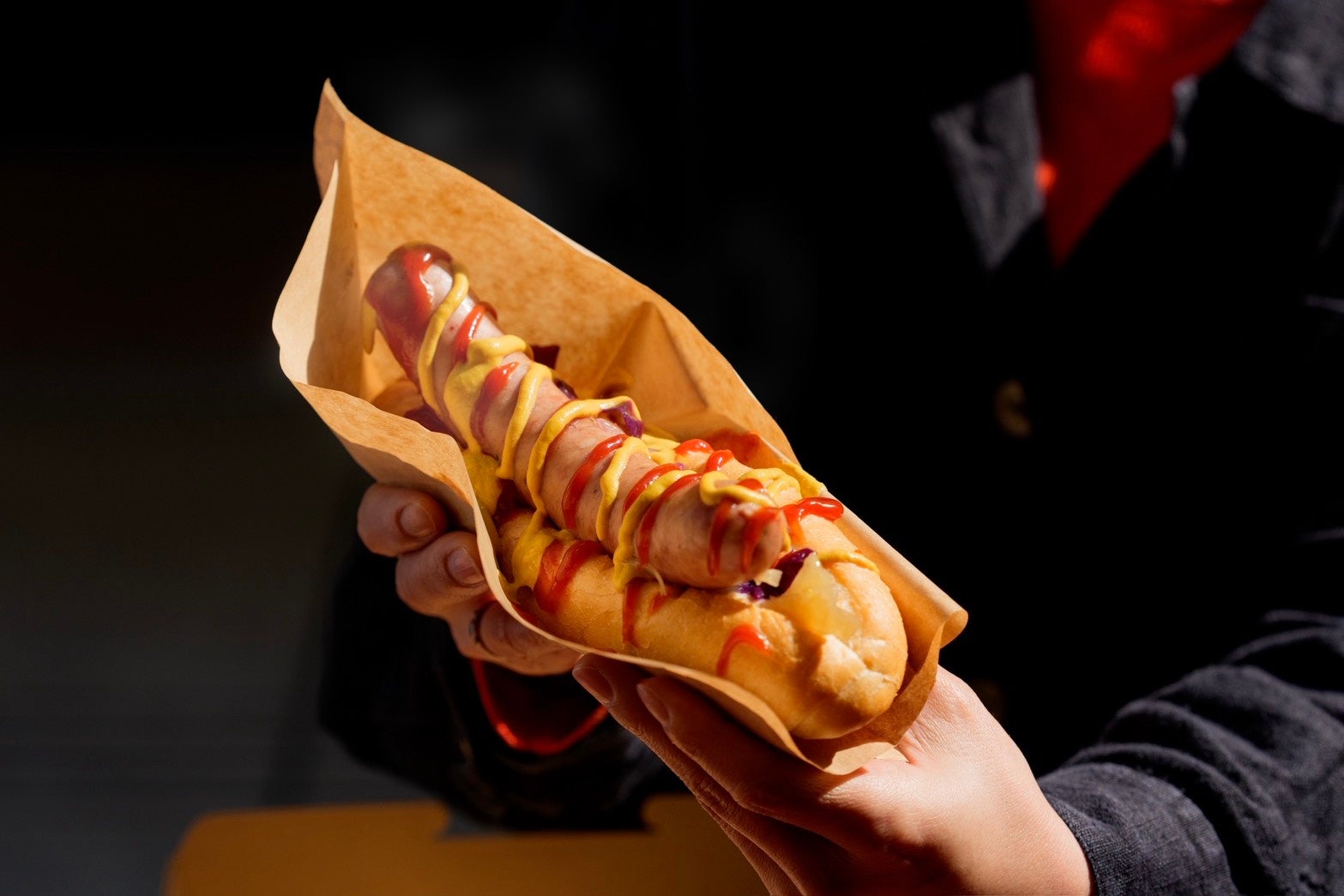 テイクアウトメニューとして提供するホットドッグは、パンから豪快にはみ出すソーセージが特徴。スタジアム観戦前後にも気軽に楽しめる一品として展開します。バル利用だけでなく、立地を活かした“持ち歩けるグルメ”としても訴求します。