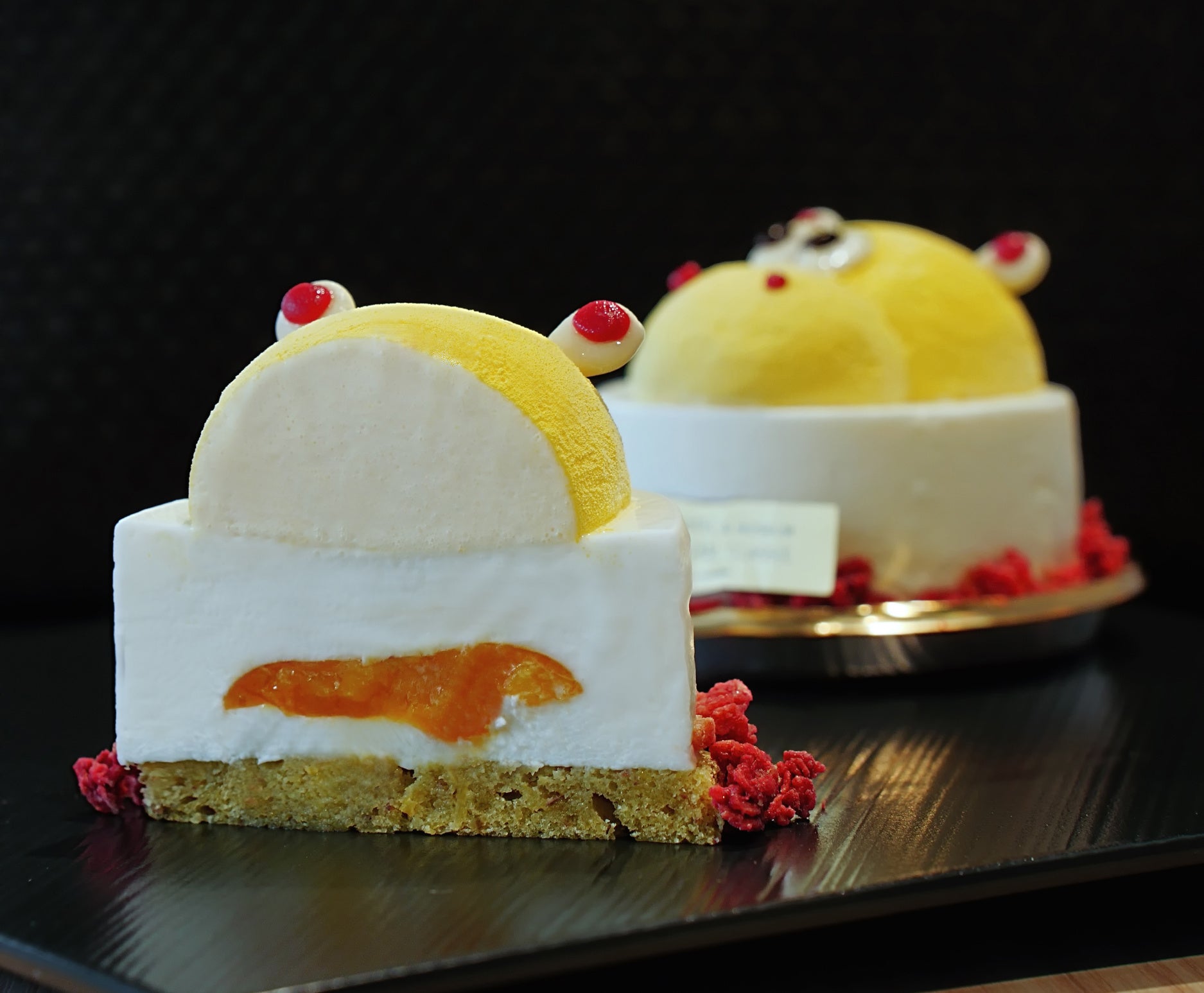 土台には、なめらかな口どけのレアチーズムースを配し、その中心にはアニスのほのかなスパイス感を効かせたマンゴーのコンフィチュールを忍ばせました。