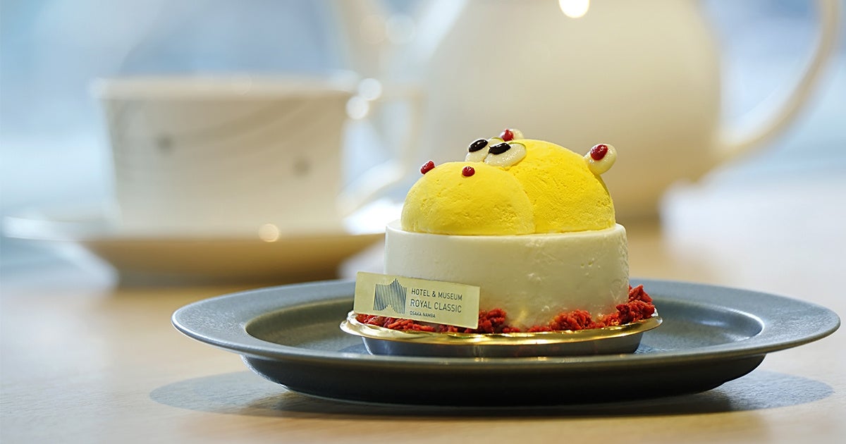 このたび、同氏の承認を得て、同シリーズの「黄色いカバ」作品に着想を得たオリジナルケーキを制作し、ホテル内カフェラウンジにて販売中です。なお、本商品は期間限定・数量限定でのご提供となります。