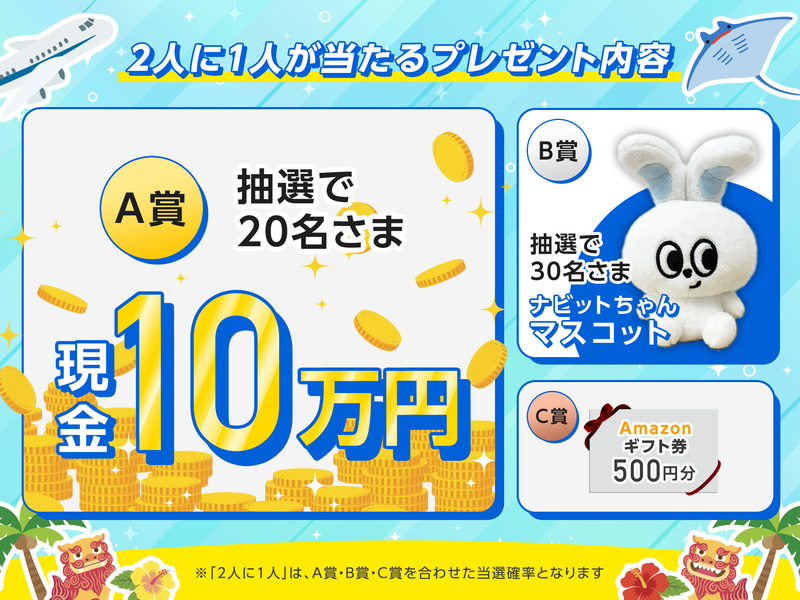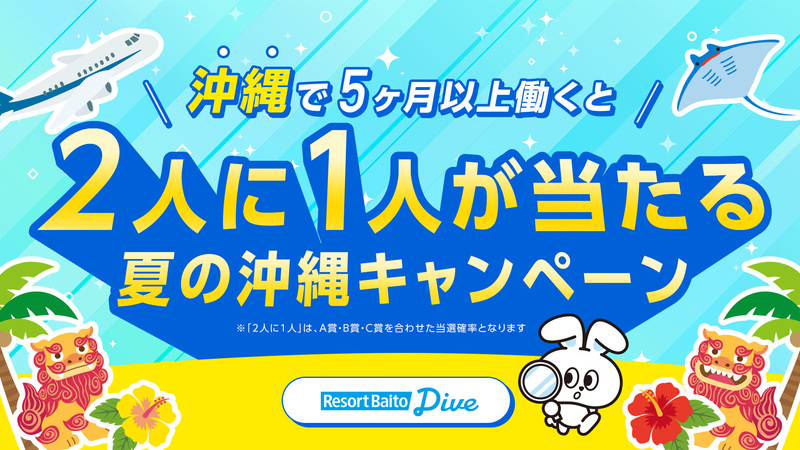この度、リゾートバイトダイブは、沖縄で5ヶ月以上のリゾートバイトをスタートした方を対象に『2人に1人が当たる沖縄リゾートバイトキャンペーン』を開始しました。対象となる方には、現金10万円やダイブ公式キャラクター「ナビットちゃん」のオリジナルマスコットなどが、2人に1人の確率で当たる(*2)キャンペーンです。