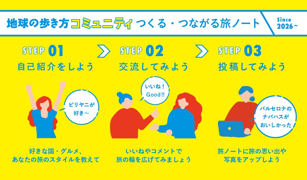 このたびオープンした「つくる・つながる旅ノート 地球の歩き方コミュニティ」も同様に、集う旅人たちと地球の歩き方が、旅や世界にまつわる情報を共有できる「旅ノート」のような存在を目指します。またコミュニティを通じて、新しい旅先や仲間と出会い、世界をより身近に感じていただける場となれば幸いです。