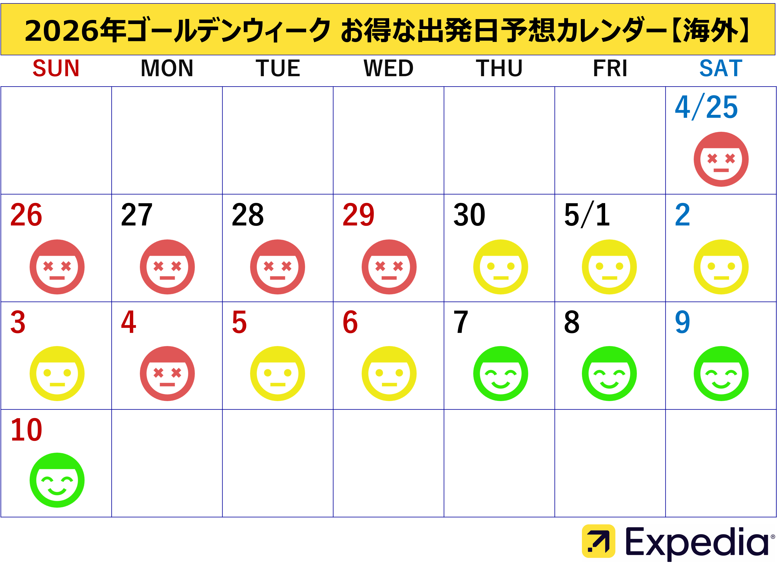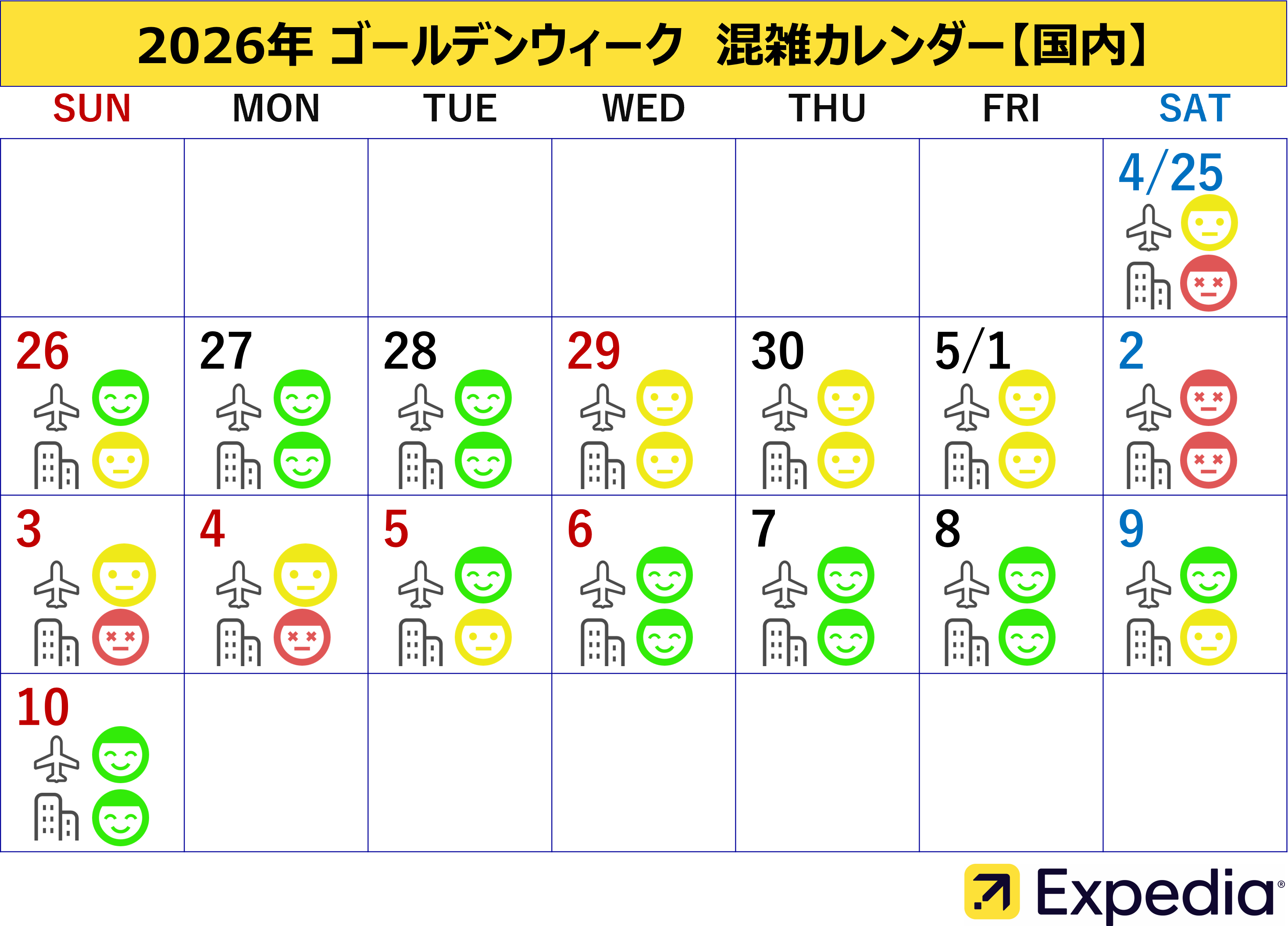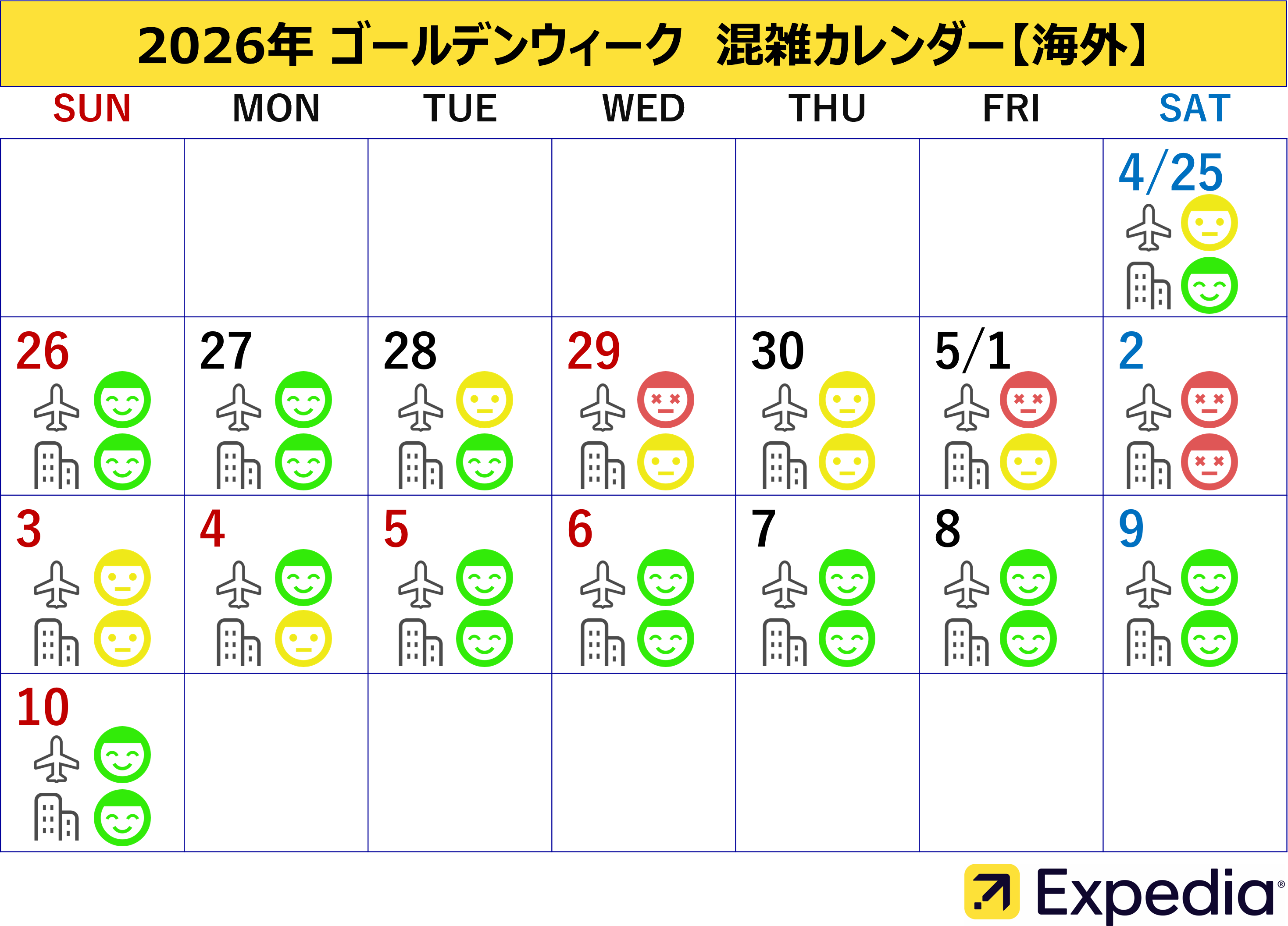 今年のゴールデンウィークは最大12連休となるため、旅行需要の高まりが見込まれます。エクスペディアのフライト検索データ*6によると、2026年4月26日(日)から5月10日(日)の期間で、海外と国内フライトともに最も混雑が予想されるのは5月2日(土)です。一方、海外へのフライトで比較的混雑が少ないと予想されるのは5月5日(火・祝)、国内では5月7日(木)となっており、5月2日(土)は、これらの比較的空いている日と比べて、海外・国内へのフライトが約7倍の混雑となる可能性があります。さらに海外では4月29日(水・祝)、5月1日(金)も混雑が予想されており、連休前半から出発が集中する傾向に。