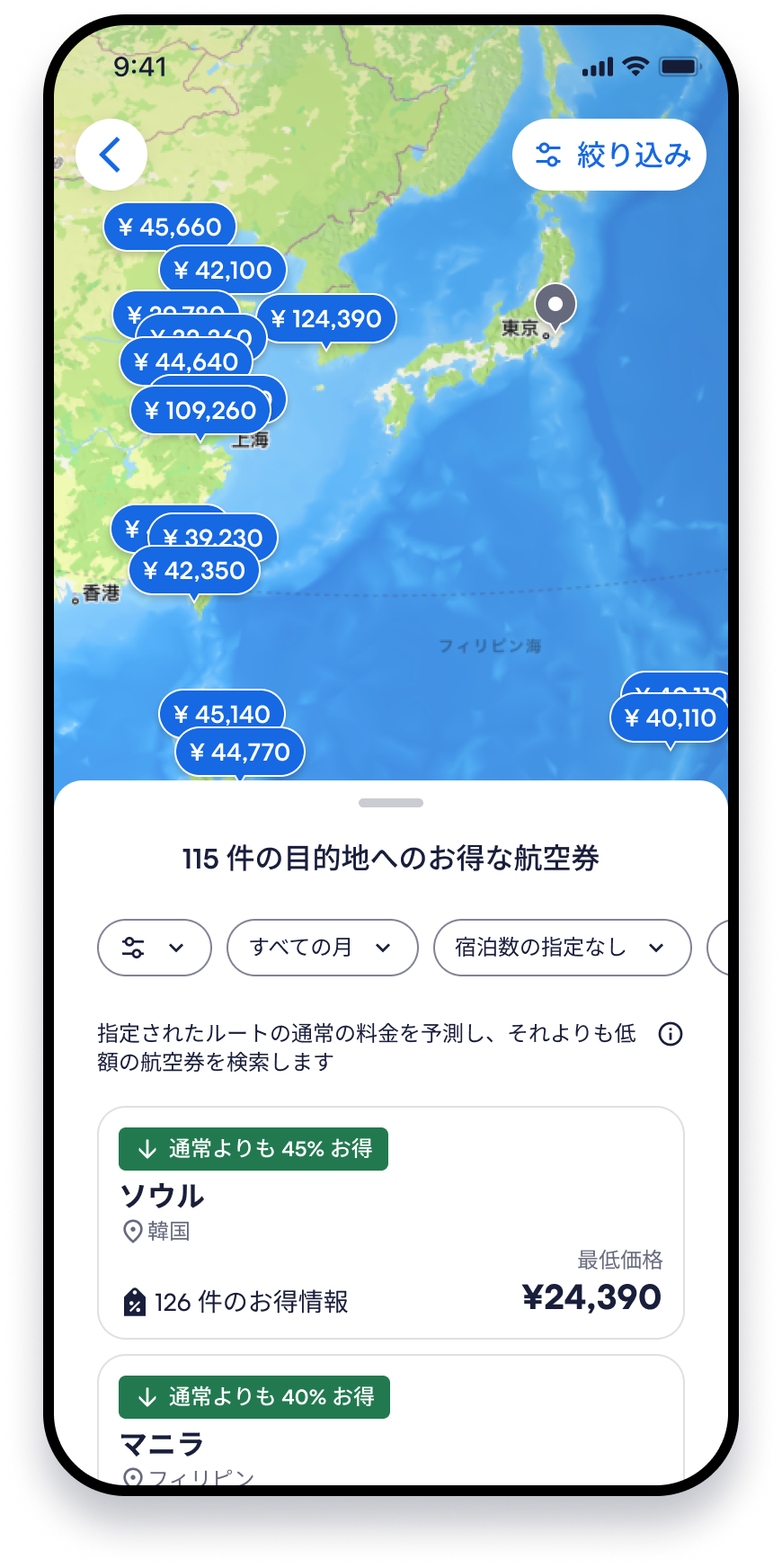 *9 プライストラッカーはエクスペディア会員限定の機能です。表示される過去のフライト価格は、エクスペディアでの特定の検索条件とフィルターに基づいて旅行者とエクスペディアが検索した結果に基づく、1日あたりの最低価格のフライトです。価格は 1 人あたりで、税金と手数料が含まれています。