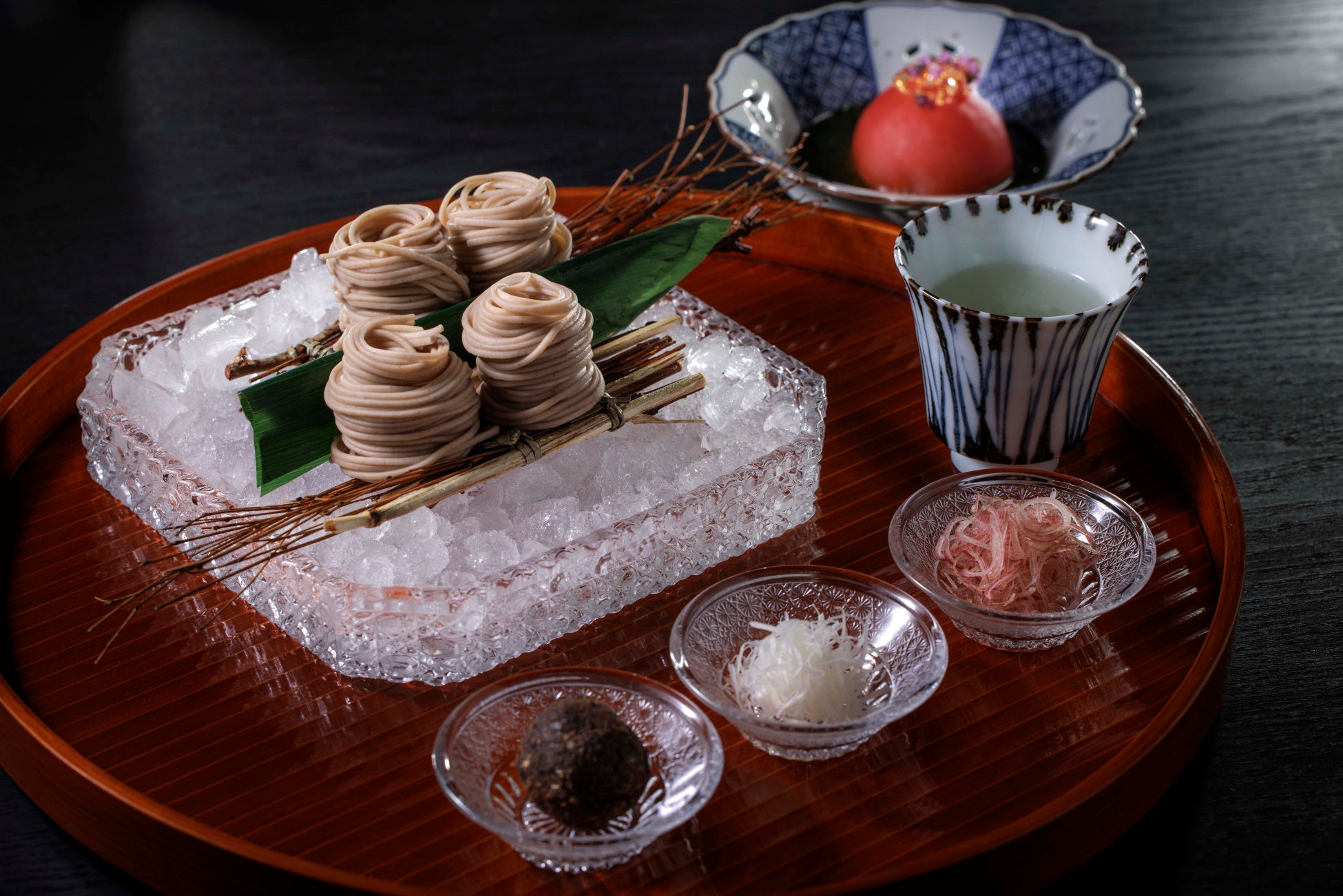 心地よい眠りへと導くためには、体内の熱を冷まし、消化に良い食材を使った夕食が良いとされています。このことから、夕食では、東洋医学において「涼性」とされる蕎麦を取り入れます(*4)。大根の絞り汁に味噌を溶かしたつけだれで食す郷土料理「おしぼり蕎麦」を用意。さらに、深部体温を下げると言われる高原野菜を使用した「フルーツトマトの蜜煮」を添え、内臓に負担をかけず、体を冷ます夕食で、心地よい眠りへの準備を行います。