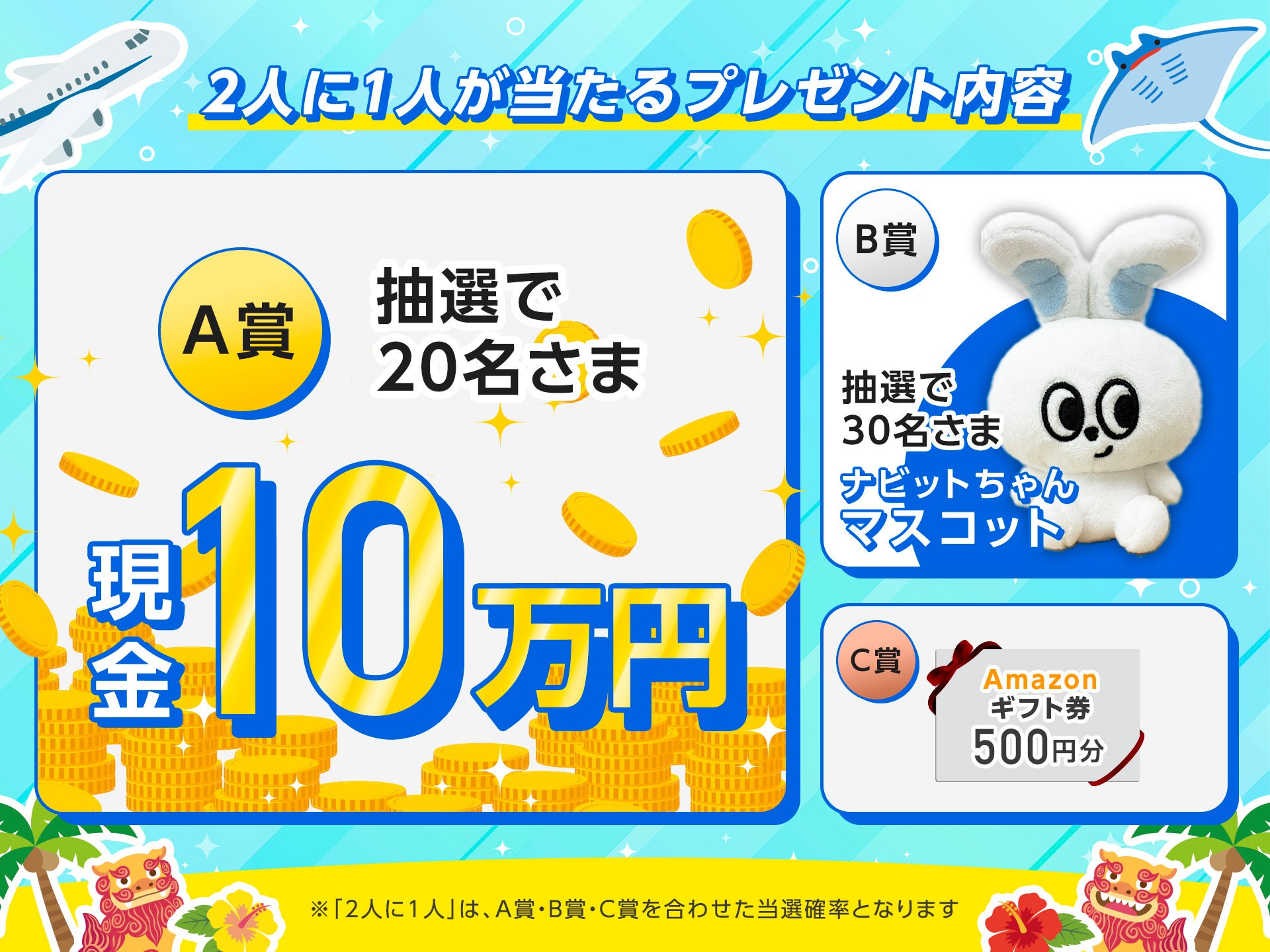 この度、リゾートバイトダイブは、沖縄で5ヶ月以上のリゾートバイトをスタートした方を対象に『2人に1人が当たる沖縄リゾートバイトキャンペーン』を開始しました。対象となる方には、現金10万円やダイブ公式キャラクター「ナビットちゃん」のオリジナルマスコットなどが、2人に1人の確率で当たる(*2)キャンペーンです。
