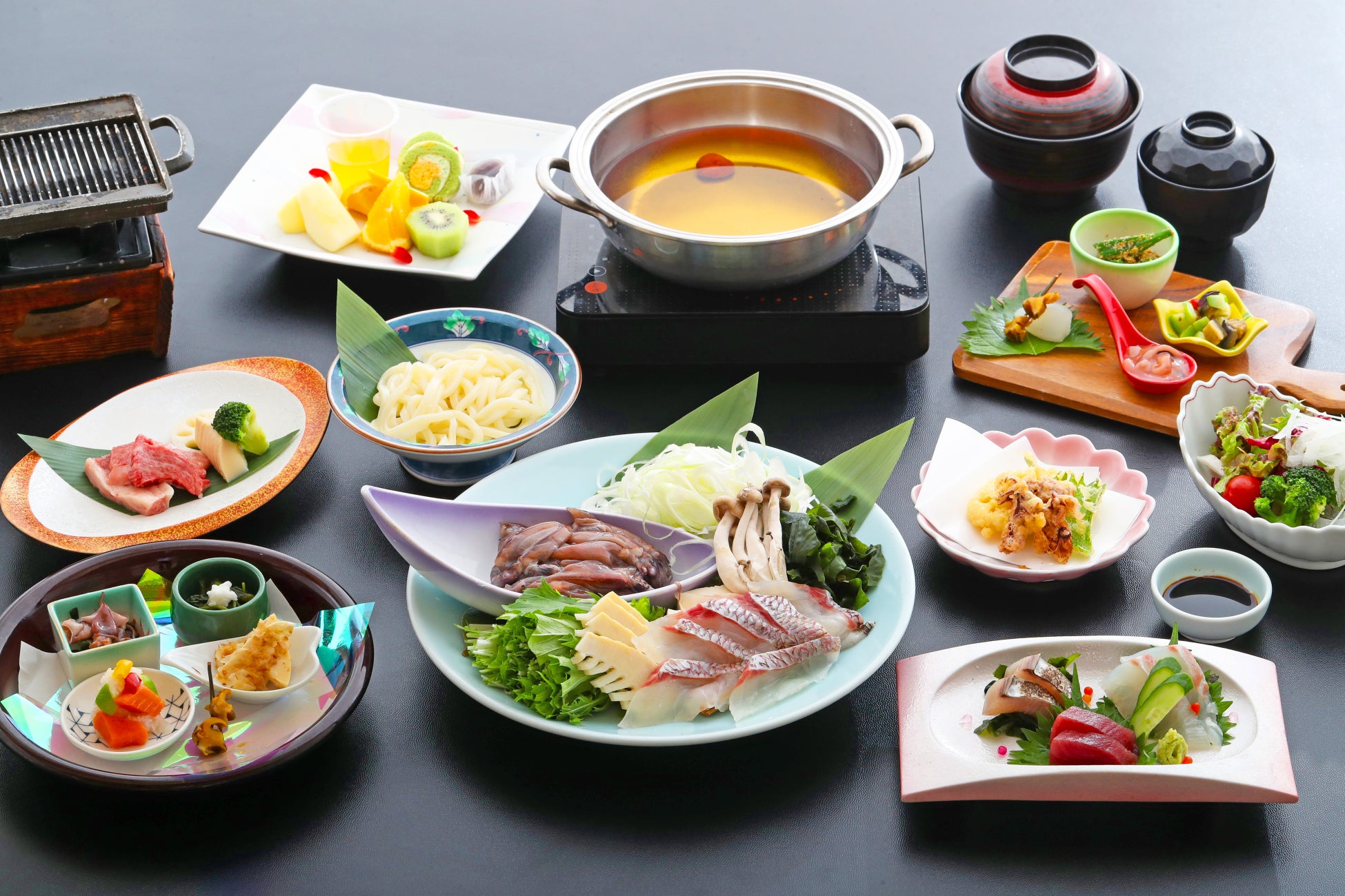 (小鉢、ご飯、汁物、郷土料理、サラダ、デザートなど)