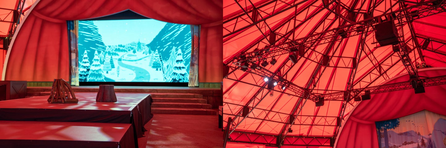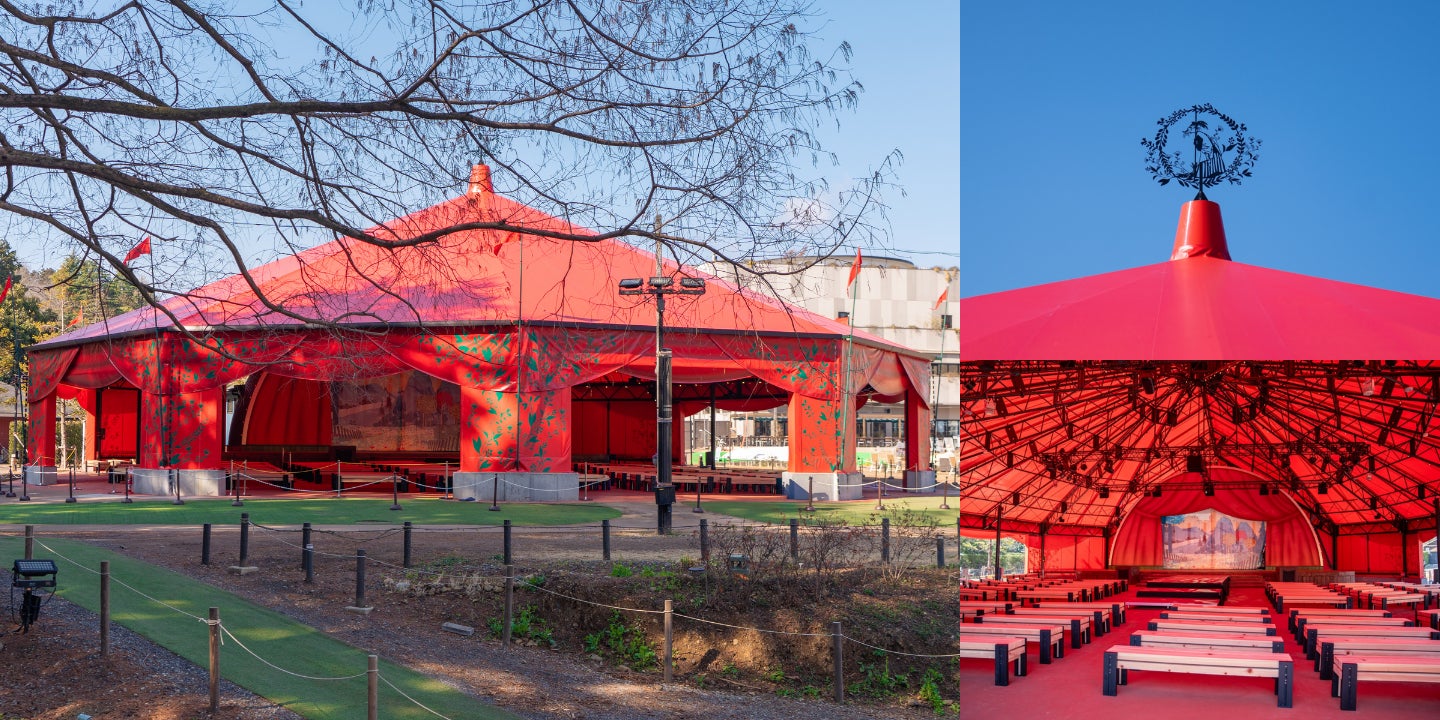 赤地にアイビーの葉の模様が印象的な大型テントを備え、進化を遂げた「全天候型シアター」をお披露目。テントの頂点には、劇場の名前の由来となった「エンマ」のシルエットを模した飾りが取り付けられ、雨や日差しが遮られた、天候に左右されず物語の世界へ没入できる空間が整いました。客席には飯能の「西川材」を使用したベンチが並び、木のぬくもりに包まれた快適な鑑賞体験を提供します。