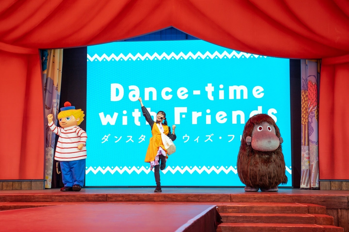 新プログラム『Dance-time with Friends』は、日によって異なるキャラクターが登場するライブ感あふれるダンスプログラム。内覧会でのお披露目では、大人気のご先祖さまとトゥーティッキが登場し、ムーミンバレーパークオリジナルソングに合わせたダンスで会場を盛り上げました。