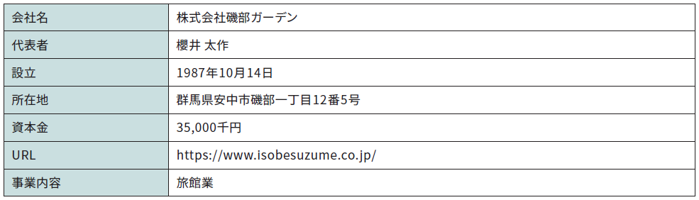 株式会社磯部ガーデン(代表取締役社長:櫻井 太作/本社:群馬県安中市/以下 同社)は、群馬県安中市で老舗旅館「舌切雀のお宿 磯部ガーデン」を運営しています。過疎化が進む温泉街で、同社は櫻井社長を中心に、温泉旅館の運営に留まらず、磯部温泉全体のにぎわい創出に向けて挑戦を続けています。