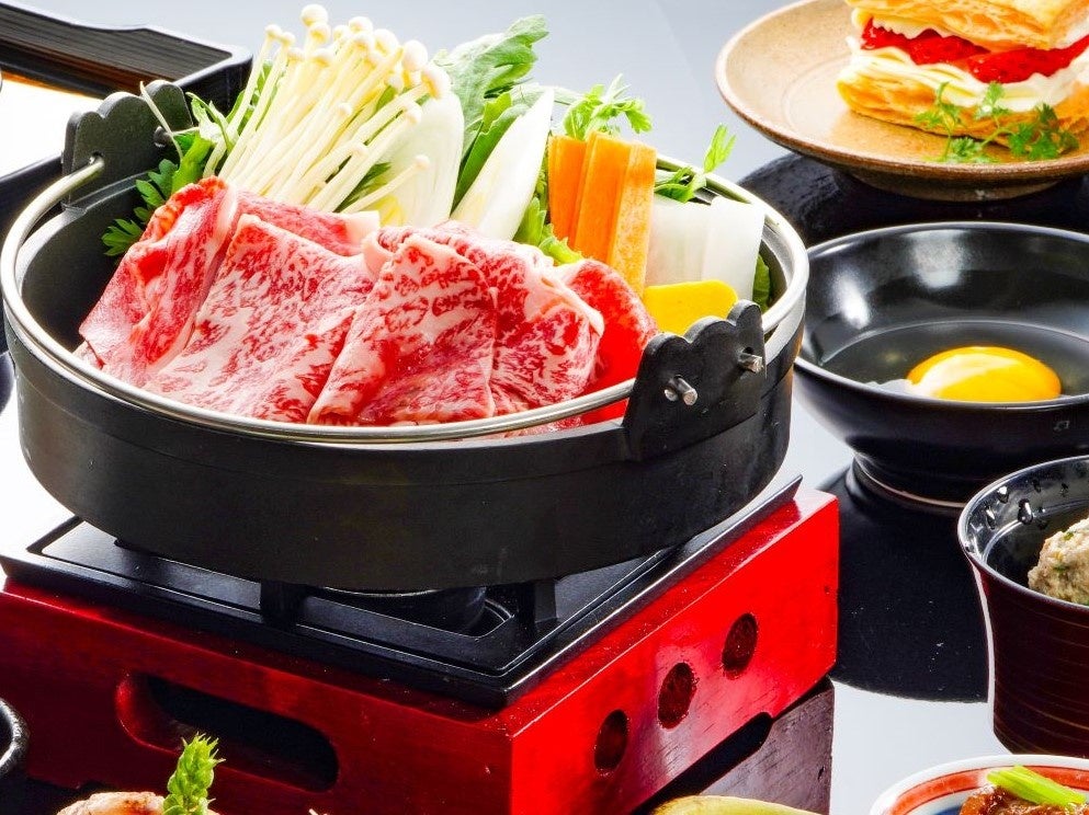 台の物:まつなが牛リブロースすき焼き(雲南市木次町産の平地飼い卵で)— 島根を代表する和牛を贅沢に。