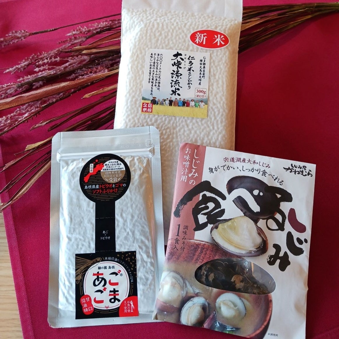 朝食ブッフェでも人気の「仁多米」「あごごま」「しじみの味噌汁」を詰め合わせました。旅の余韻をご自宅でも楽しめる、特別な贈りものです。