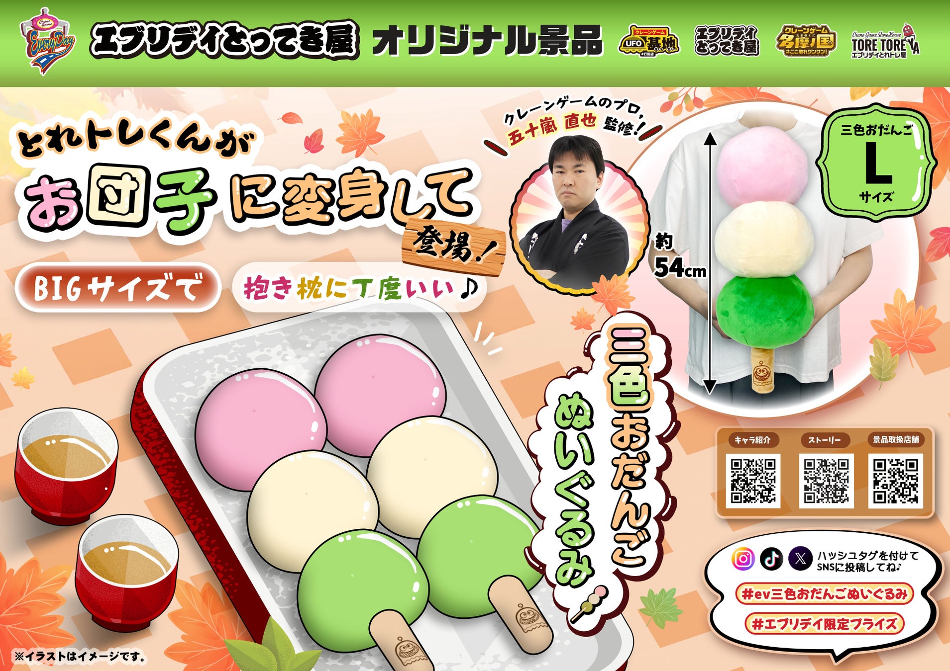本商品はクレーンゲームのプロ五十嵐直也監修により企画された、エブリデイオリジナル景品です。三色団子をモチーフにした全長約54cmのビッグサイズぬいぐるみです。三色団子をモチーフにした全長約54cmのビッグサイズなぬいぐるみで、和菓子特有のやさしい色合いと、愛らしい丸みのあるフォルムを再現しました。串の部分には、エブリデイとってき屋のオリジナルキャラクター「トレ」の刺繍を施し、限定景品としての特別感を演出しています。抱き枕としてもご使用いただけるボリューム感があり、インテリアとしても存在感のある仕様です。また、和スイーツをモチーフにした親しみやすいデザインで、幅広い世代のお客様にお楽しみいただける商品となっております。