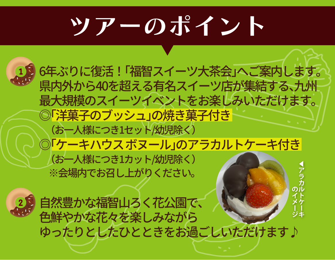 「福智スイーツ大茶会」には、県内外から40店以上のスイーツ店が自慢の逸品とともに福智町に集結。ケーキ1カットと焼き菓子セット(各お一人様につき1点/幼児除く)をプレゼントします。また、春の花々が咲き誇る「福智山ろく花公園」での散策もお楽しみいただけます。