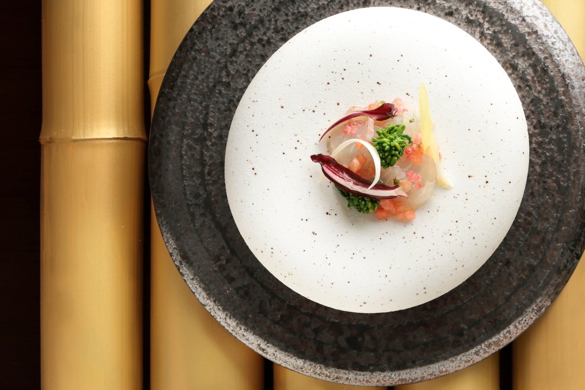 シグネチャーコース「和城」にてご提供する「天然真鯛の昆布締め 桜の香り」は、昆布の旨味をまとわせた真鯛に桜の香りが寄り添う、日本料理の美意識とセントレジスの洗練を映す一皿。ほのかな桜の香りが余白のように寄り添い、春の気配を上品に印象づけます。