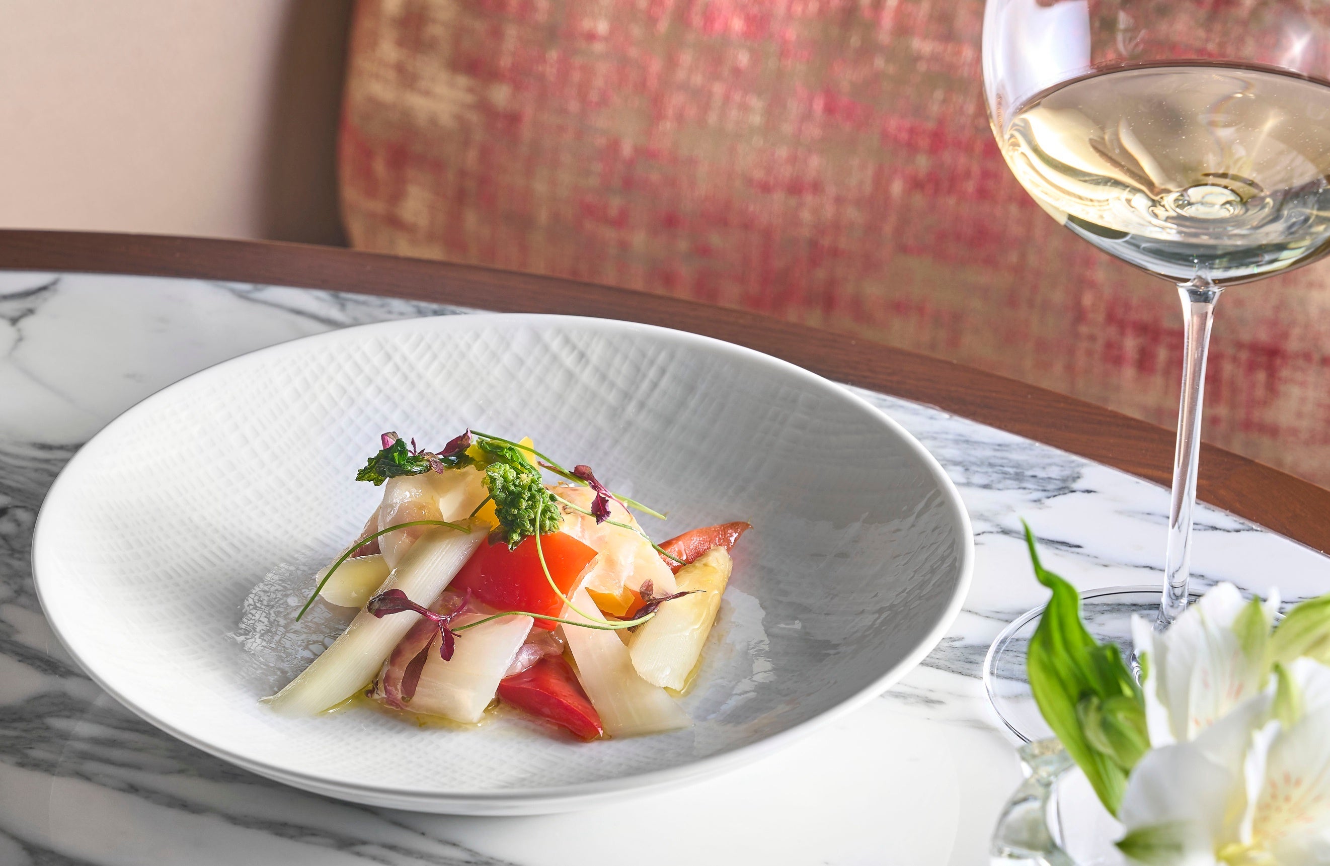 ブラッスリー「RÉGINE」では、「ホワイトアスパラガスと季節野菜のグレッグ 柚子の香りの明石鯛のマリネと共に」が春のテーブルを彩ります。春に旬を迎える明石鯛は、皮目をさっと湯引きすることで皮と身の間に凝縮された旨味を引き出し、ほのかに柚子の香りを纏わせた軽やかなマリネに。やわらかな甘みを湛えたホワイトアスパラガスと色とりどりの季節野菜を、ホワイトバルサミコでやさしくまとめたグレッグが寄り添い、素材それぞれの持ち味を引き立てます。淡い色彩と爽やかな香りが響き合い、桜の季節にふさわしい軽やかな余韻を描きます。