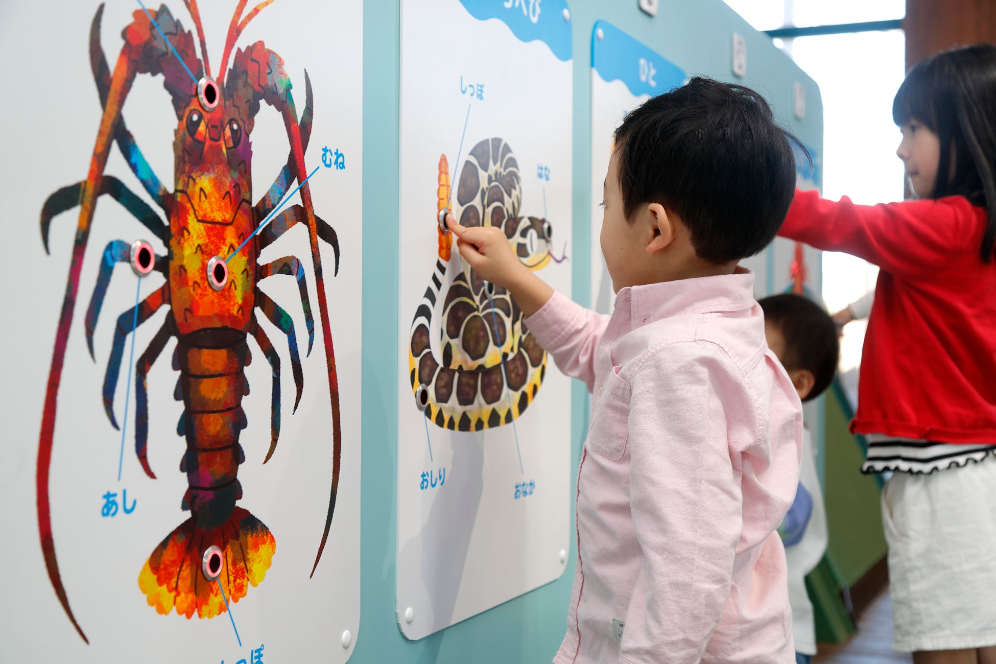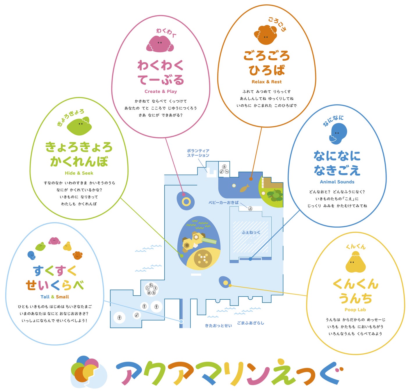 新しい「アクアマリンえっぐ」は、 「あそび」と「まなび」がちりばめられた6つのゾーンが広がり、五感を使って生き物たちの生きる工夫「いのちのアイデア」を体験できる幼い子どもたち向けのコーナーです。本コーナーには、以下の2つの特徴があります。