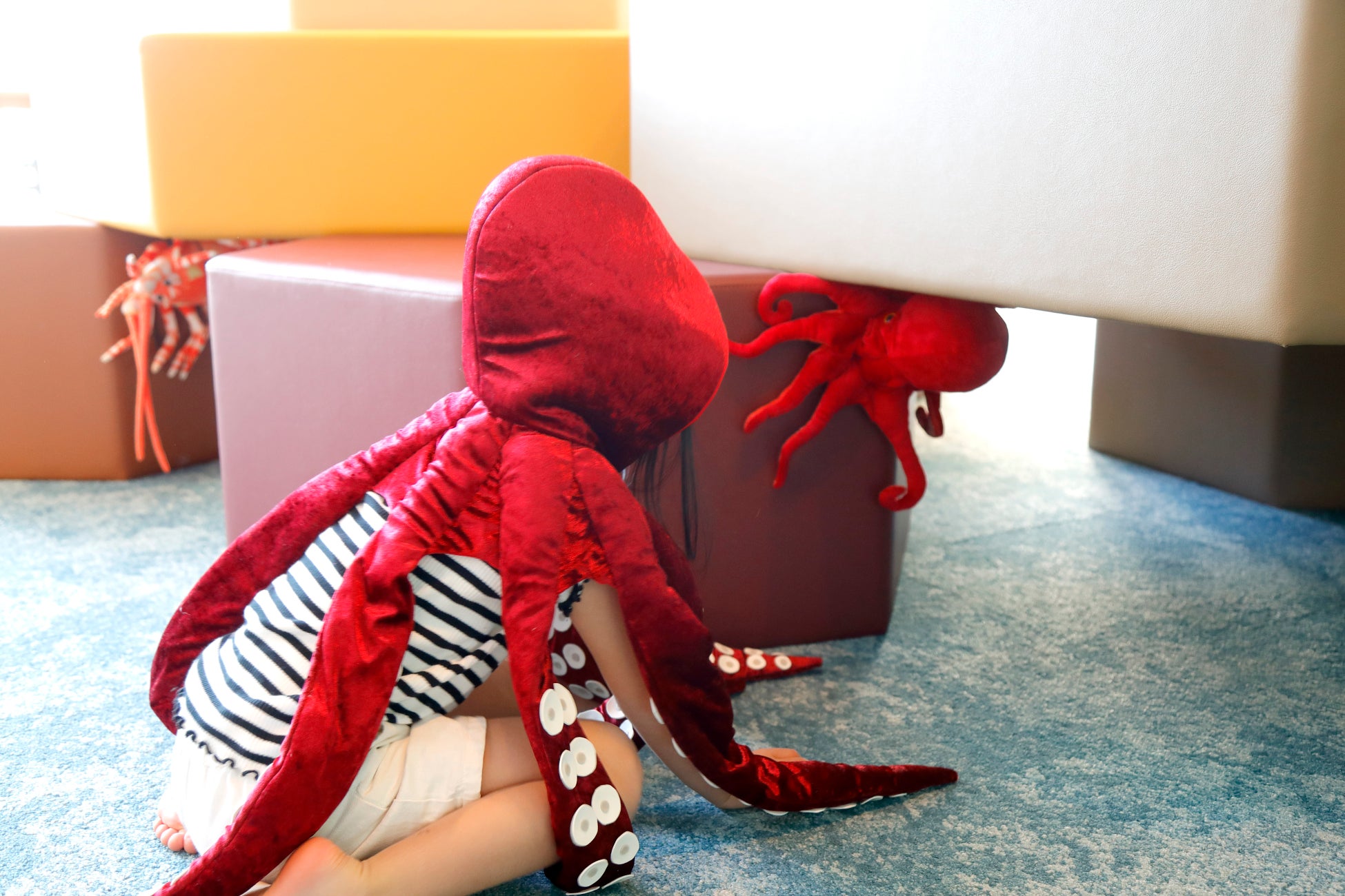 ウミガメやウツボなどのかくれた生き物のイラストやぬいぐるみをさがしたり、タコやヒラメ、ヤドカリのように生き物の気分でかくれてみたり。海の世界で生き物たちの生きるための工夫を体験できるゾーンです。ここでは、なりきりグッズを使って、砂地、岩場、海藻の中でかくれんぼを楽しめます。生き物たちがどんな風にかくれて暮らしているか、体験してみましょう。