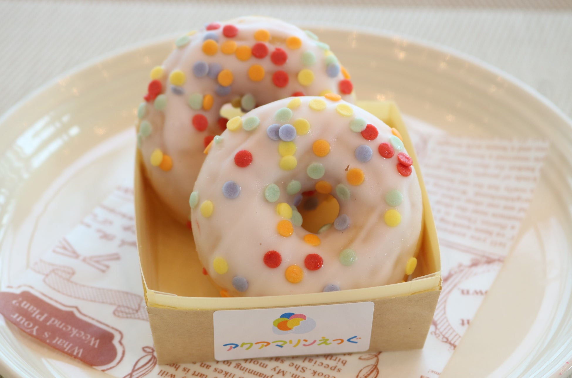 フワフワのミニドーナツの上にアイシングチップがのっています。アクアマリンえっぐのロゴは、五感で楽しむわくわく感を表現しています。そのロゴの色をイメージしたカラフルなドーナツをお楽しみください。