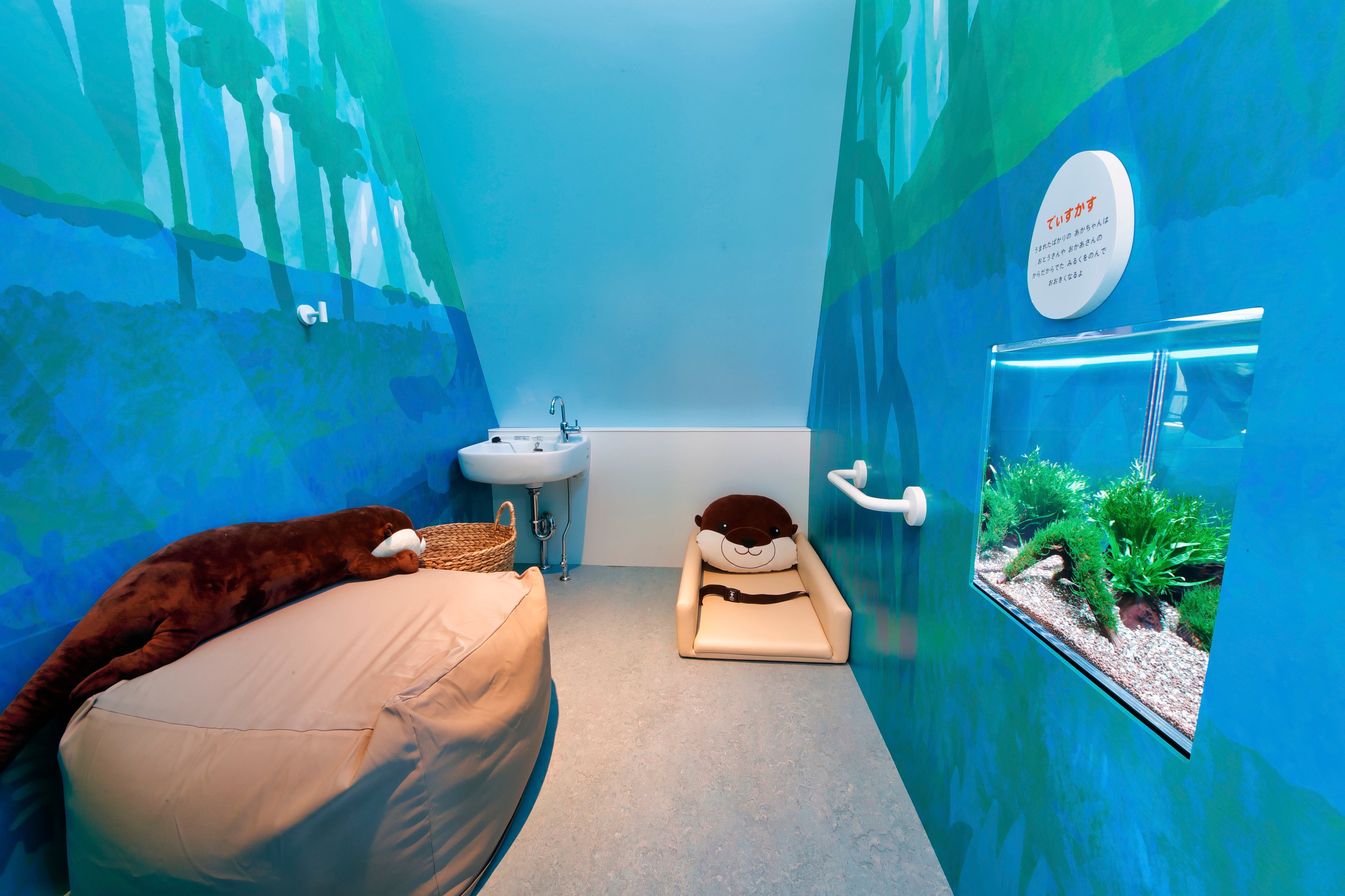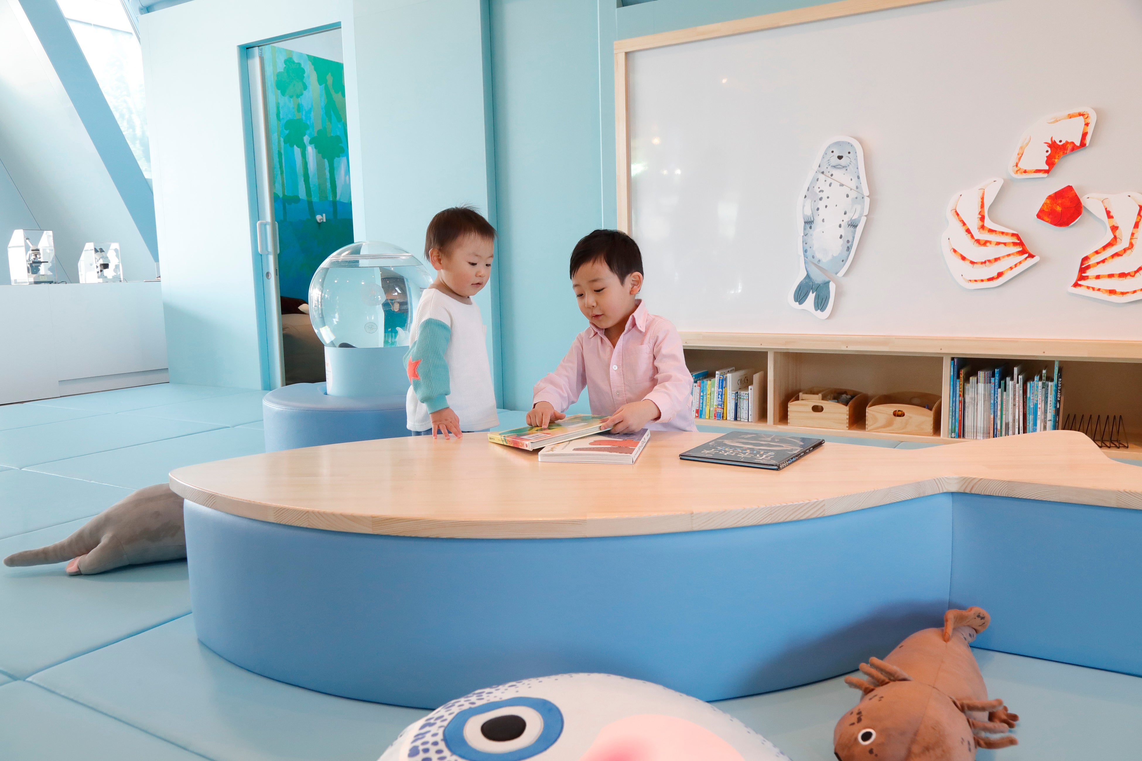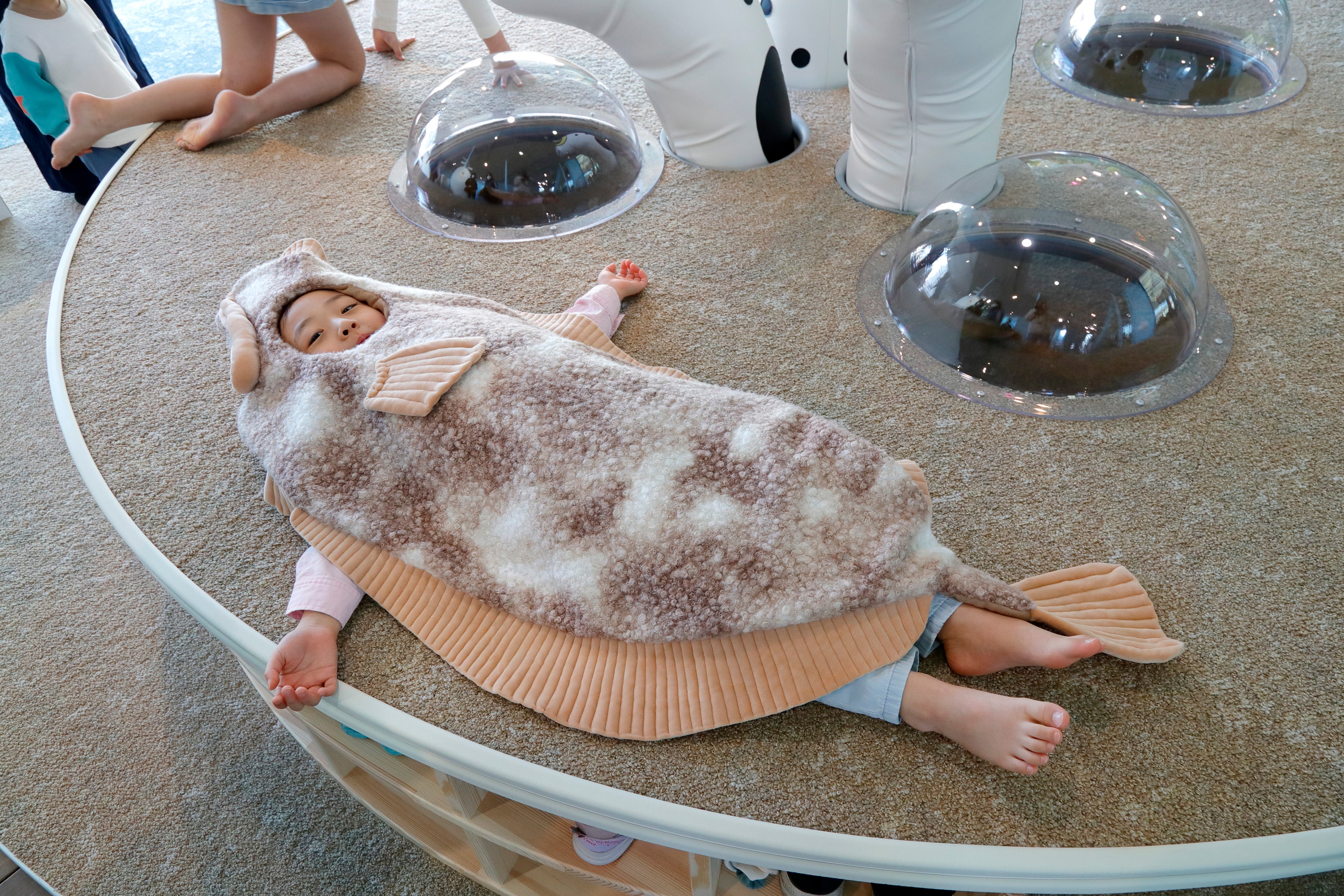 親子で水槽を眺めながらごろごろしたり、動物の巣穴にもぐりこんだり。赤ちゃんがゆったり過ごせるゾーンです。ごろごろできるエリア「のんびり海(うみ)」には、親子でみやすいように水槽を設置しました。おむつ替えや授乳をしながら水槽を眺めれられるベビーケアルームもあります。「すごもり島(じま)」では、巣材を持ち込んで生き物の巣穴におこもりできます。ユーラシアカワウソなど動物のはく製があり、子どもが自ら発見し、観察する喜びを味わえます。