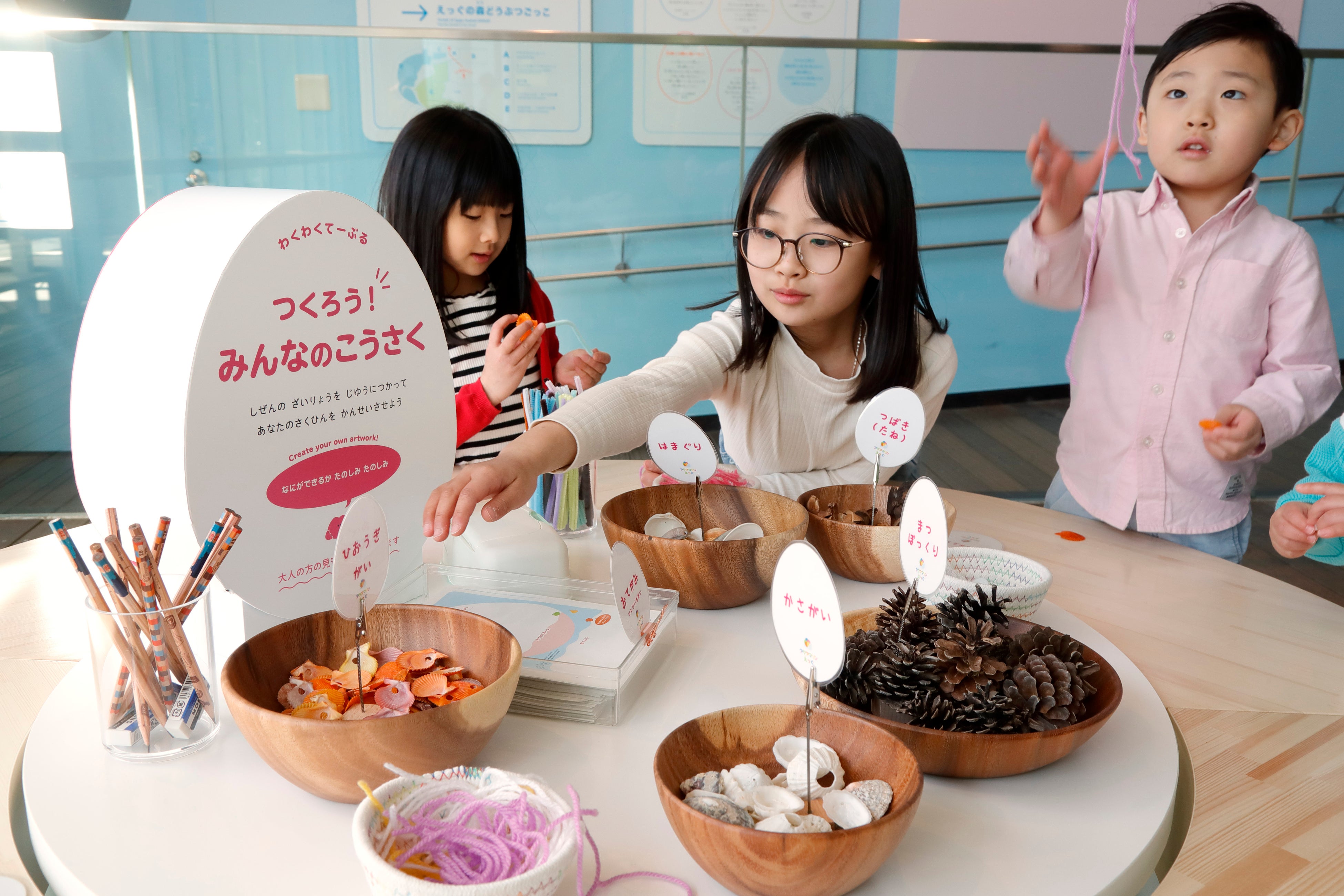 アクアマリンえっぐのテーマに合わせた工作スペース。貝がら、木の実などさまざまな自然素材に触れながら、自由な発想を育むゾーンです。自分のオリジナル作品を作って楽しめます。作品はお持ち帰りいただけます。