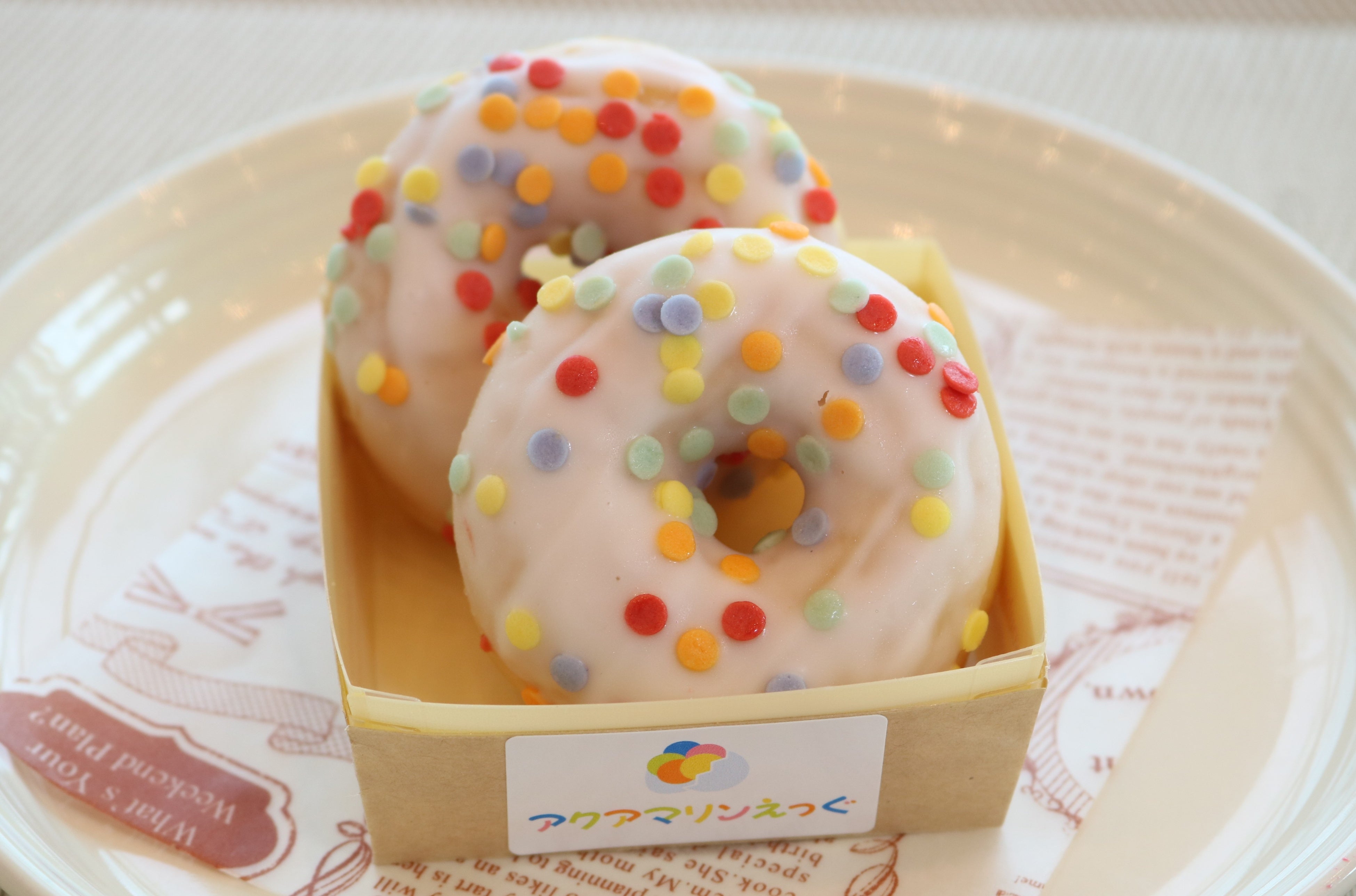 フワフワのミニドーナツの上にアイシングチップがのっています。アクアマリンえっぐのロゴは、五感で楽しむわくわく感を表現しています。そのロゴの色をイメージしたカラフルなドーナツをお楽しみください。